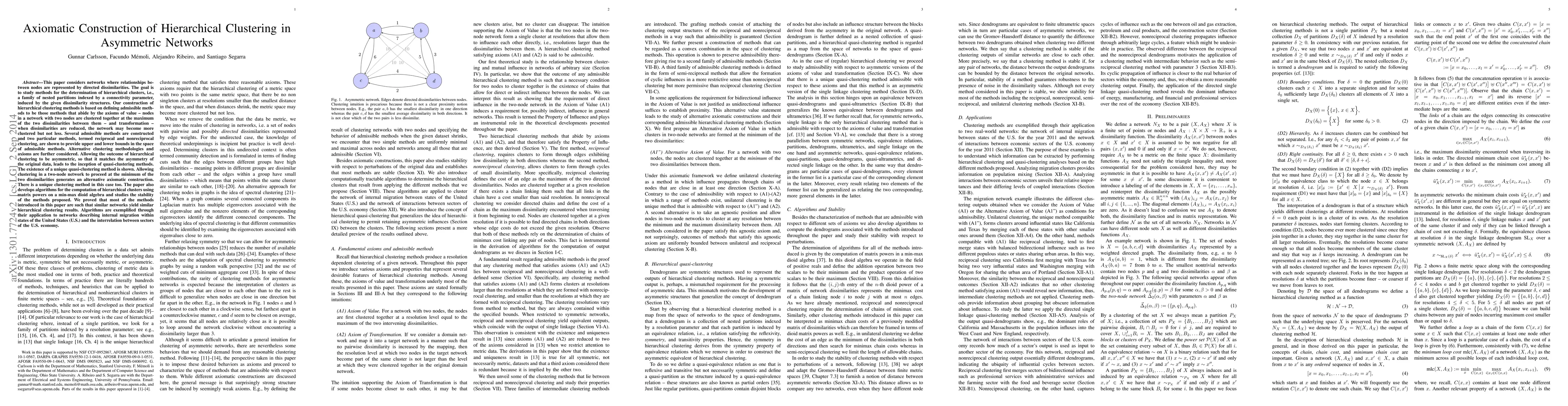 This paper develops axiomatic methods for hierarchical clustering in asymmetric networks, defining admissible methods based on value and transformation axioms. It introduces reciprocal and nonreciprocal clustering methods, proving their bounds and the existence of unique quasi-clustering methods. Algorithms based on matrix powers in min-max dioid algebra are proposed, demonstrating stability and applicability to U.S. migration and economic sector networks.