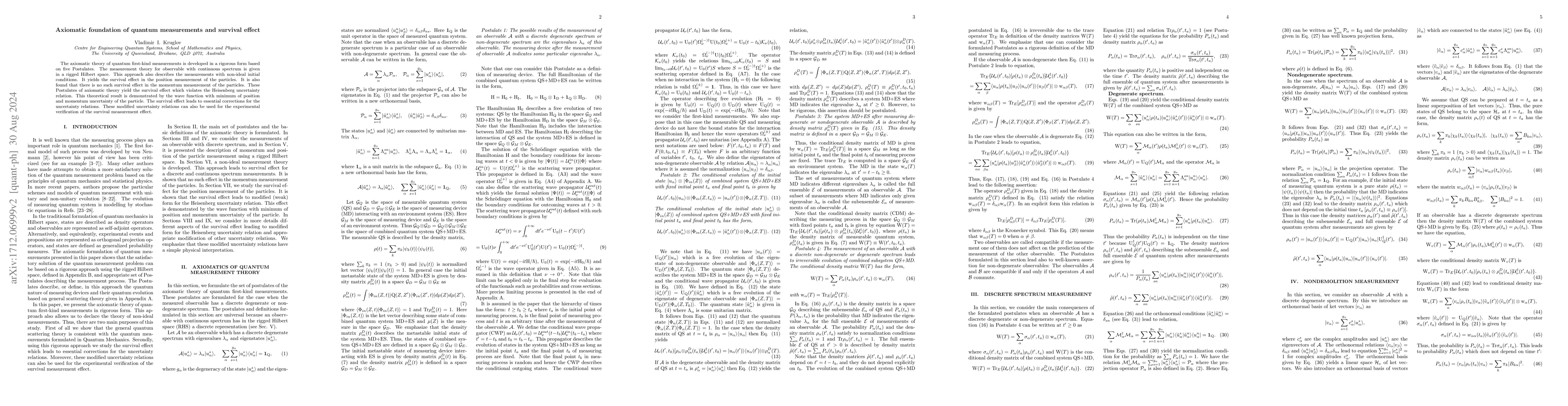 The axiomatic theory of quantum first-kind measurements is developed in a rigorous form based on five Postulates. The measurement theory for observable with continuous spectrum is given in a rigged Hilbert space. This approach also describes the measurements with non-ideal initial conditions. It yields the survival effect in the position measurement of the particles. It is also found that no such survival effect in the momentum measurement of the particles. The Postulates of axiomatic theory yield the survival effect which violates the Heisenberg uncertainty relation. This theoretical result is demonstrated by the wave function with minimum of position and momentum uncertainty of the particle.