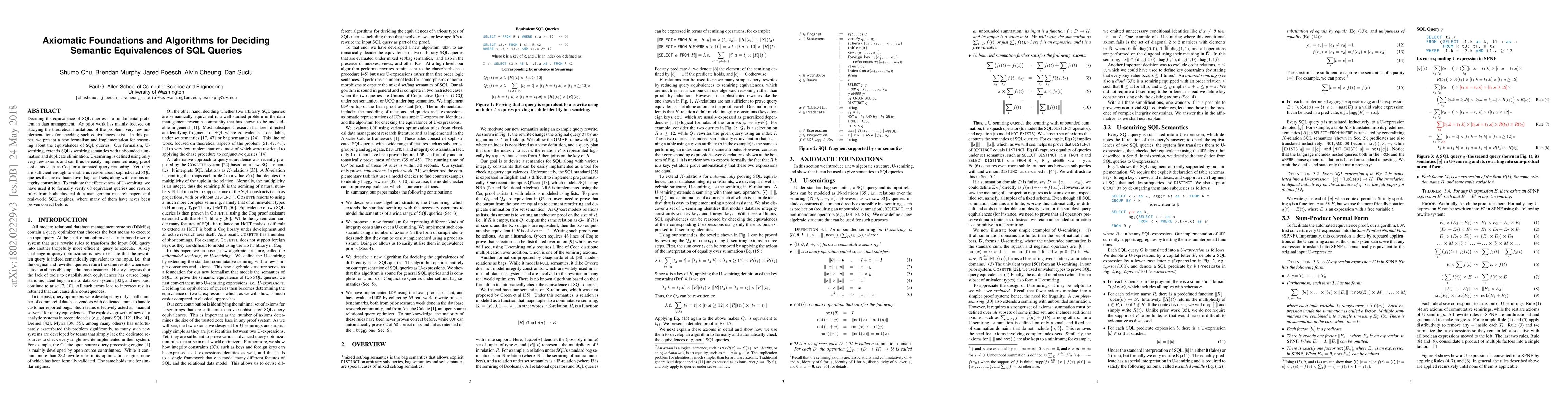This paper introduces U-semiring, a new formalism extending SQL's semiring semantics, to decide SQL query equivalences. It employs minimal axioms for implementation in proof assistants like Coq, enabling reasoning about complex queries involving bags, sets, and integrity constraints.