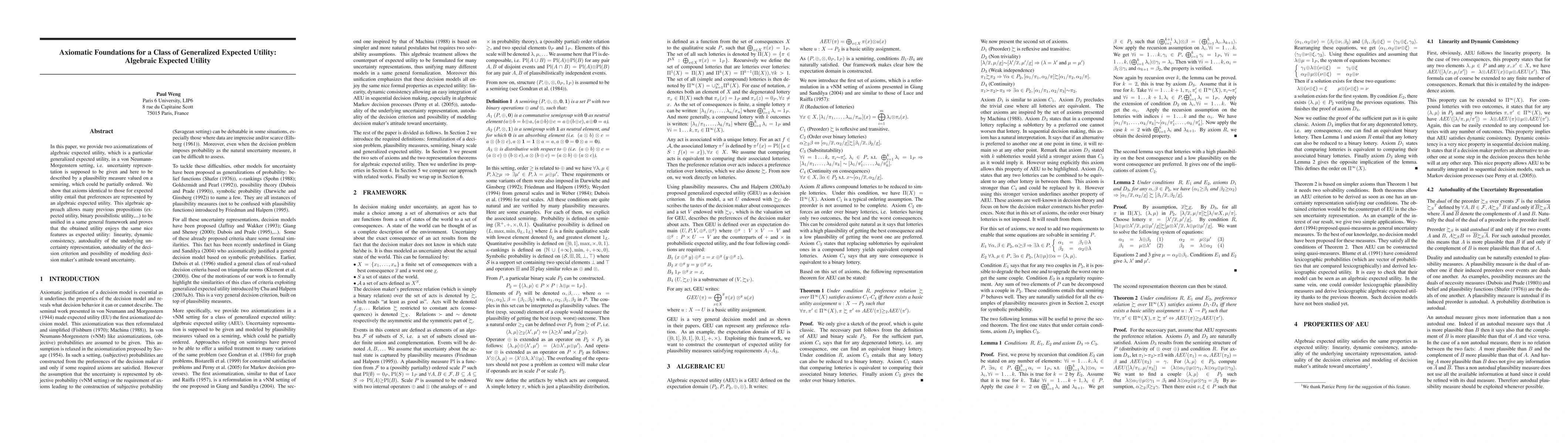 Expected Utility: Algebraic Expected Utility In this paper, we provide two axiomatizations of algebraic expected utility, which is a particular generalized expected utility, in a von Neumann-Morgenstern setting, i.e. uncertainty representation is supposed to be given and here to be described by a plausibility measure valued on a semiring, which could be partially ordered. We show that axioms identical to those for expected utility entail that preferences are represented by an algebraic expected utility. This algebraic approach allows many previous propositions (expected utility, binary possibilistic utility,...) to be unified in a same general framework and proves that the obtained utility enjoys the same nice features as expected utility: linearity, dynamic consistency, autoduality of the underlying uncertainty measure, autoduality of the decision criterion and possibility of modeling decision maker's attitude toward uncertainty.