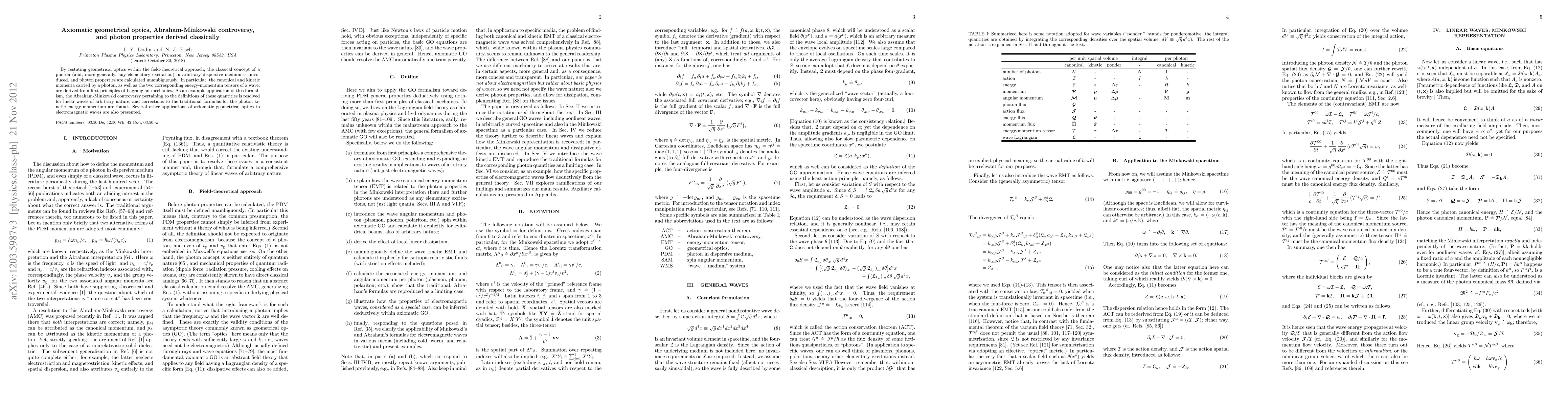 By restating geometrical optics within the field-theoretical approach, the classical concept of a photon (and, more generally, any elementary excitation) in arbitrary dispersive medium is introduced, and photon properties are calculated unambiguously. In particular, the canonical and kinetic momenta carried by a photon, as well as the two corresponding energy-momentum tensors of a wave, are derived from first principles of Lagrangian mechanics. As an example application of this formalism, the Abraham-Minkowski controversy pertaining to the definitions of these quantities is resolved for linear waves of arbitrary nature, and corrections to the traditional formulas for the photon kinetic energy-momentum are found. Several other applications of axiomatic geometrical optics to electromagnetic waves are also presented.