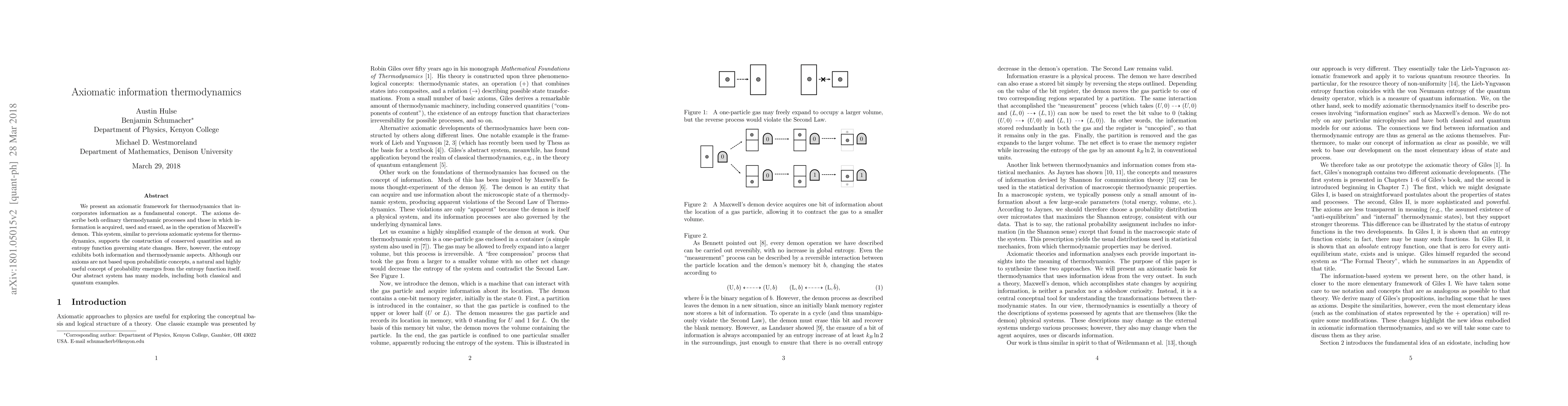 We present an axiomatic framework for thermodynamics that incorporates information as a fundamental concept. The axioms describe both ordinary thermodynamic processes and those in which information is acquired, used and erased, as in the operation of Maxwell's demon. This system, like previous axiomatic systems for thermodynamics, supports the construction of conserved quantities and an entropy function governing state changes. Here, however, the entropy exhibits both information and thermodynamic aspects. Although our axioms are not based upon probabilistic concepts, a natural and highly useful concept of probability emerges from the entropy function itself. Our abstract system has many models, including both classical and quantum examples.