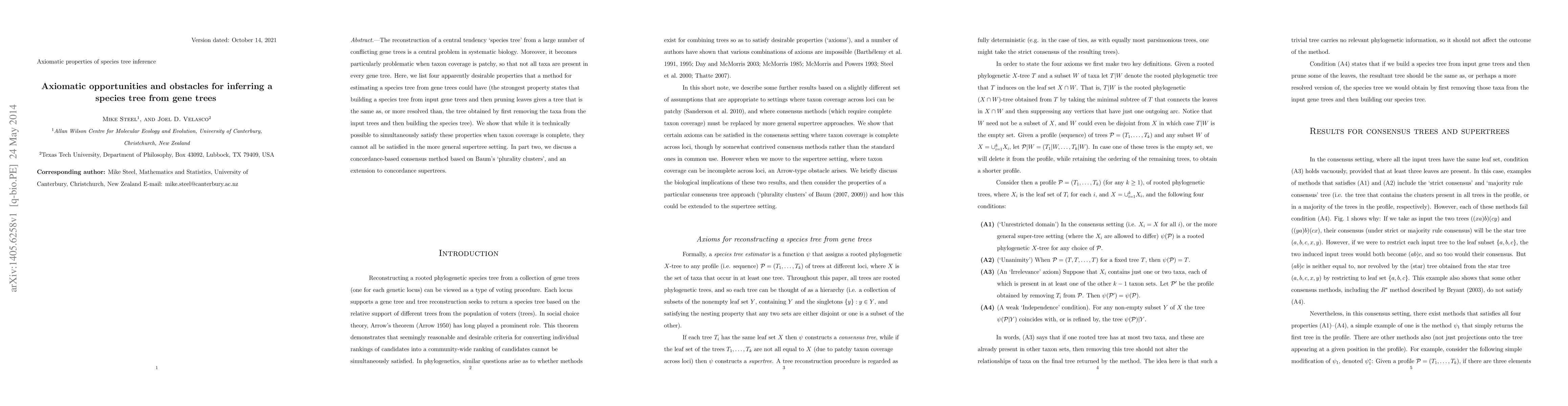 The paper presents an axiomatic analysis of methods for inferring species trees from gene trees, identifying fundamental limitations and proposing the frequency-difference consensus method as a viable solution.