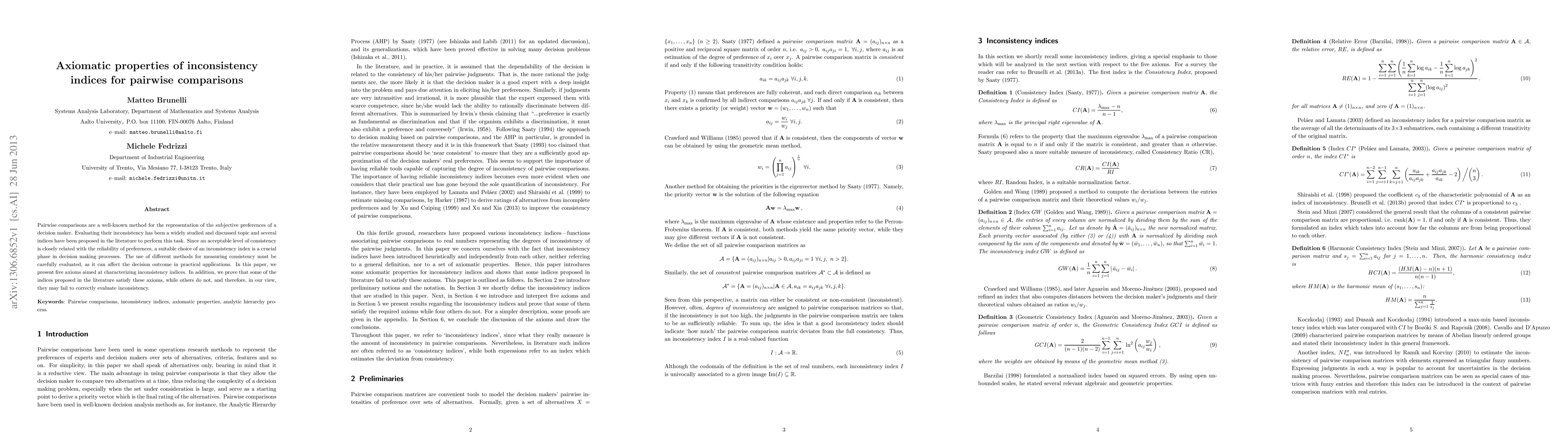 This paper proposes five axioms to characterize inconsistency indices used in pairwise comparisons for decision making. It demonstrates that some existing indices satisfy these axioms, while others do not, suggesting they may not accurately evaluate inconsistency and thus could impact decision outcomes.