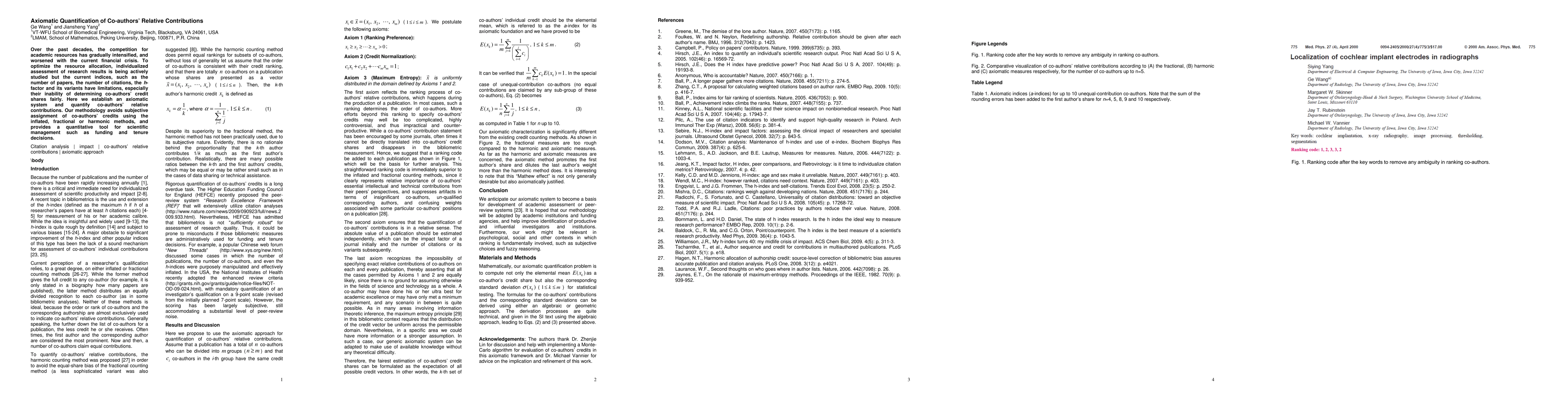 Over the past decades, the competition for academic resources has gradually intensified, and worsened with the current financial crisis. To optimize the resource allocation, individualized assessment of research results is being actively studied but the current indices, such as the number of papers, the number of citations, the h-factor and its variants have limitations, especially their inability of determining co-authors' credit shares fairly. Here we establish an axiomatic system and quantify co-authors' relative contributions. Our methodology avoids subjective assignment of co-authors' credits using the inflated, fractional or harmonic methods, and provides a quantitative tool for scientific management such as funding and tenure decisions.