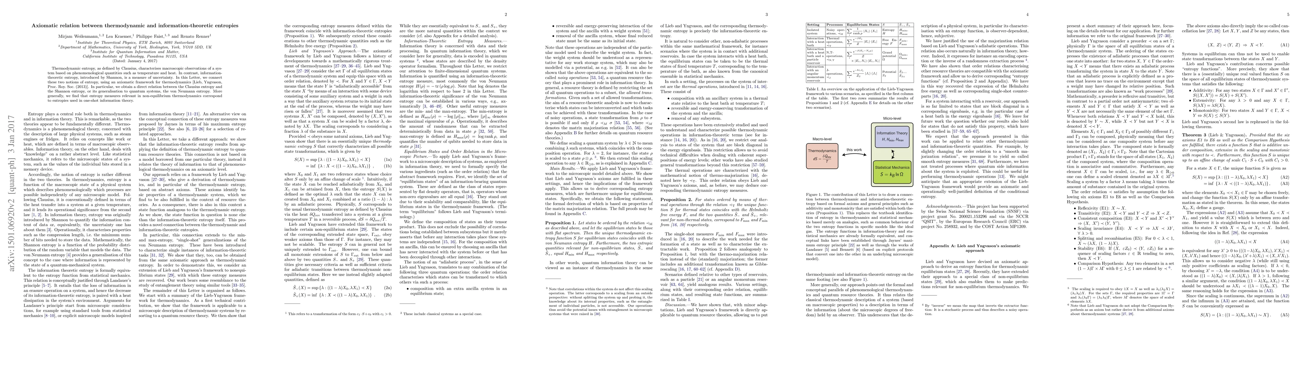 This paper establishes a connection between thermodynamic and information-theoretic entropies using an axiomatic framework. It derives a direct relation between Clausius entropy and Shannon entropy, extending the link to von Neumann entropy in quantum systems, and shows that non-equilibrium thermodynamic entropies align with one-shot information theory.