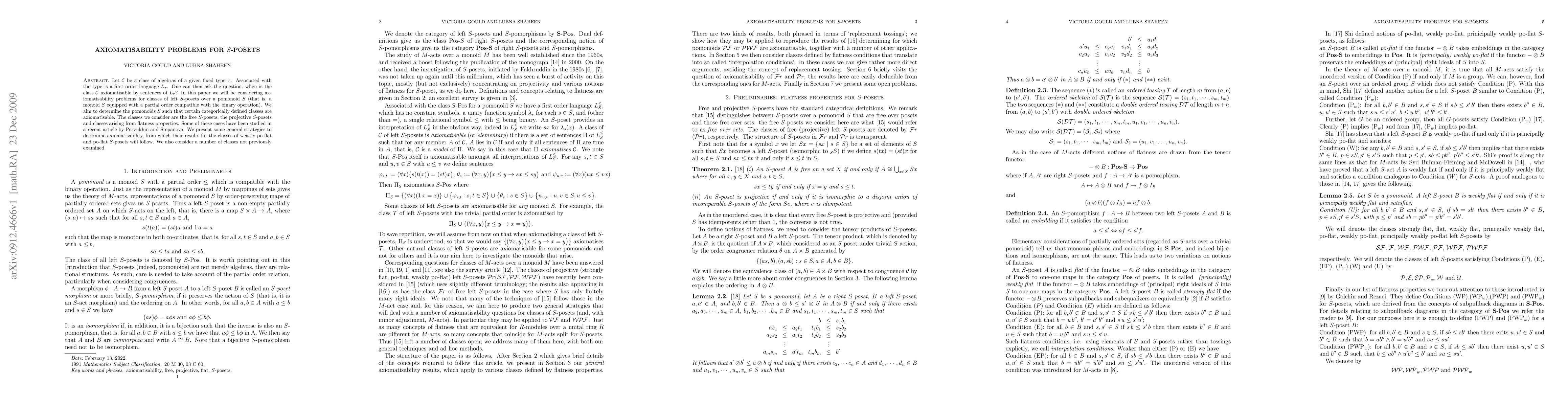 This paper explores axiomatisability problems for classes of left S-posets over pomonoid S, determining which pomonoids allow categorically defined classes like free, projective, and flatness-based S-posets to be axiomatisable. It extends previous work by Pervukhin and Stepanova and introduces new strategies for determining axiomatisability.