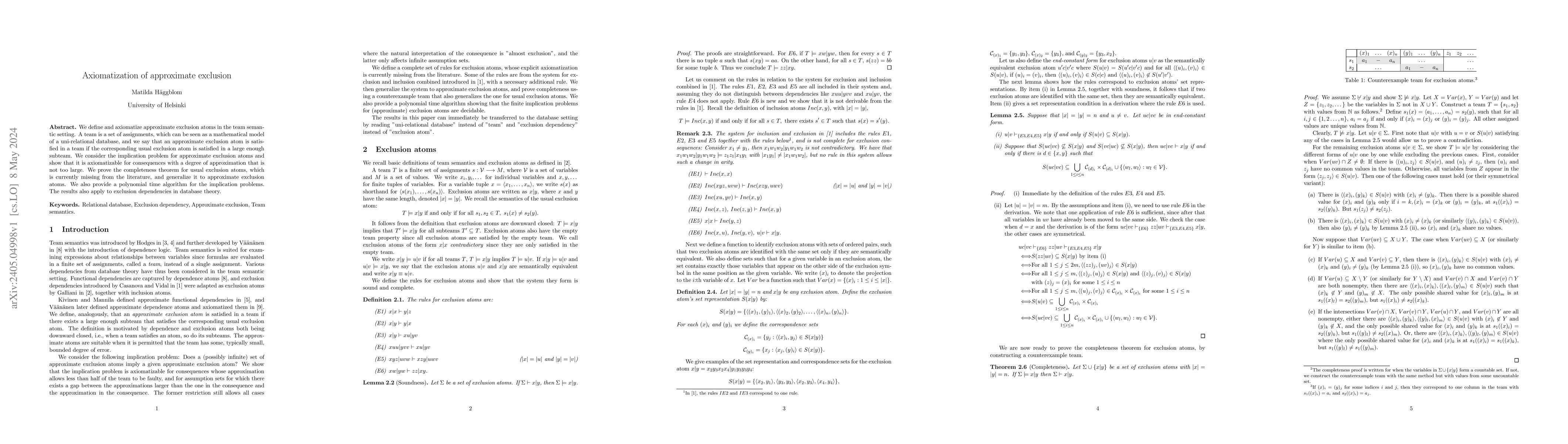 This paper axiomatizes approximate exclusion atoms within team semantics, showing the implication problem for such atoms is axiomatizable with manageable approximation degrees. It proves a completeness theorem for usual exclusion atoms and extends it to approximate cases, along with providing a polynomial time algorithm for implication problems.