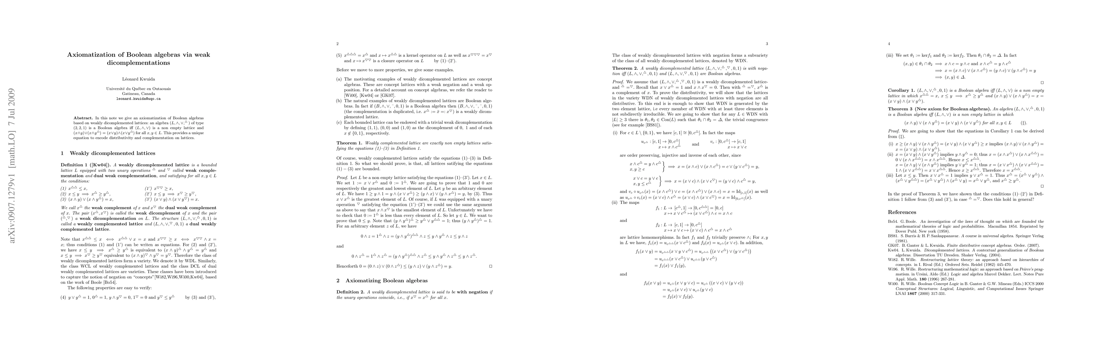 In this note we give an axiomatization of Boolean algebras based on weakly dicomplemented lattices: an algebra $(L,\wedge,\vee,\tu)$ of type $(2,2,1)$ is a Boolean algebra iff $(L,\wedge,\vee)$ is a non empty lattice and $(x\wedge y)\vee(x\wedge y\tu)=(x\vee y)\wedge(x\vee y\tu)$ for all $x,y\in L$. This provides a unique equation to encode distributivity and complementation on lattices.