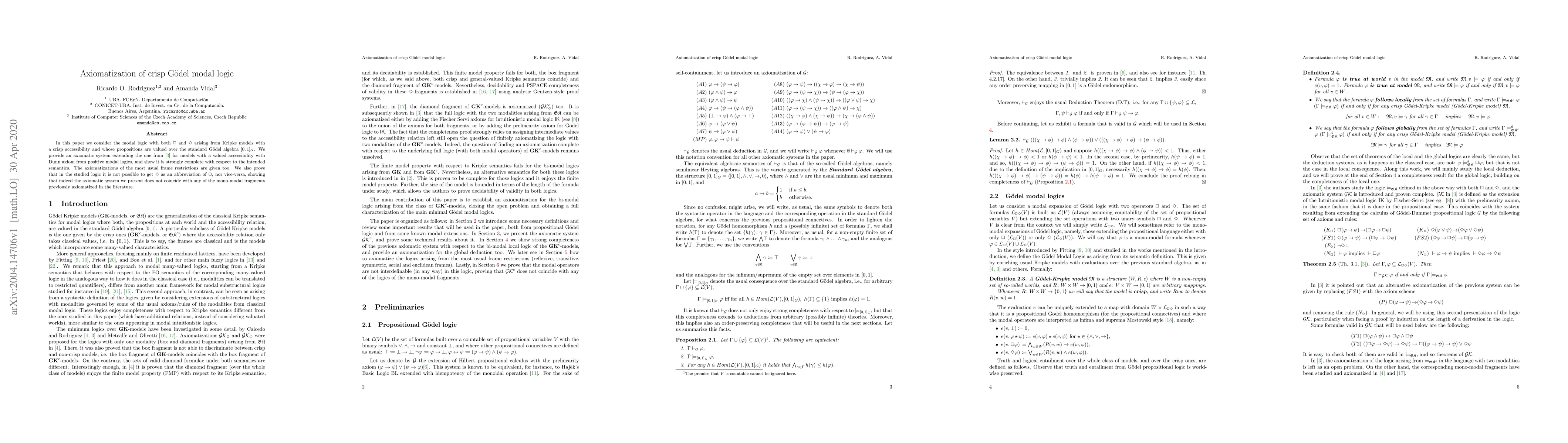 In this paper we consider the modal logic with both Box and Diamond arising fromKripke models with a crisp accessibility and whose propositions are valued over the stan-dard Godel algebra [0,1]G. We provide an axiomatic system extending the one from [3]for models with a valued accessibility with Dunn axiom from positive modal logics, andshow it is strongly complete with respect to the intended semantics. The axiomatizationsof the most usual frame restrictions are given too. We also prove that in the studied logicit is not possible to get Box as an abbreviation of Diamond, nor vice-versa, showing that indeedthe axiomatic system we present does not coincide with any ofthe mono-modal fragmentspreviously axiomatized in the literature.
