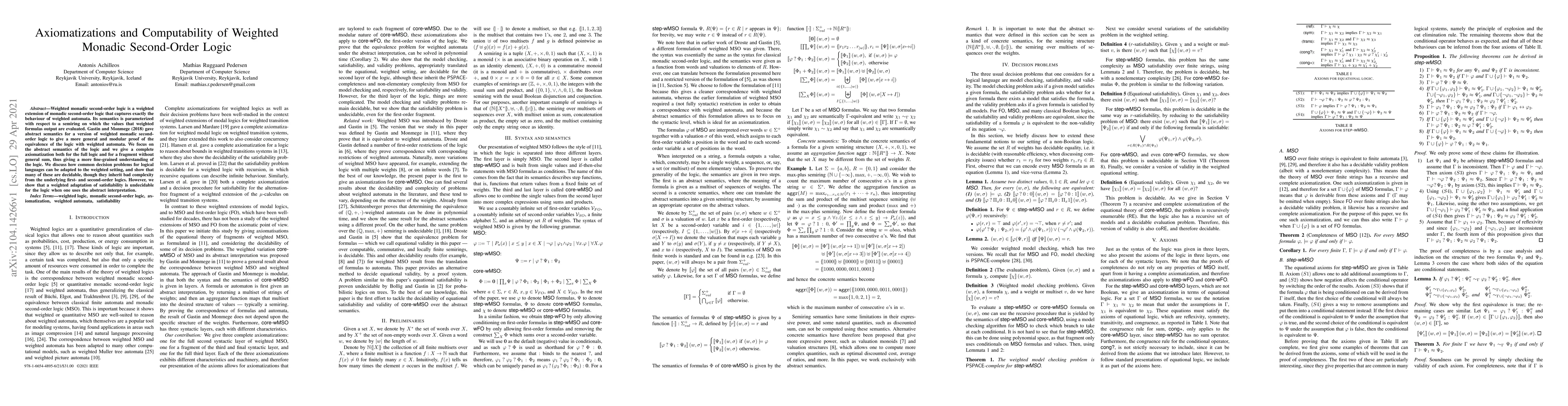 This paper presents a complete axiomatization for weighted monadic second-order logic and a fragment without general sum, exploring its abstract semantics and decidability of common decision problems, which are mostly decidable but exhibit high complexity. It concludes that a weighted adaptation of satisfiability is undecidable using the abstract interpretation.