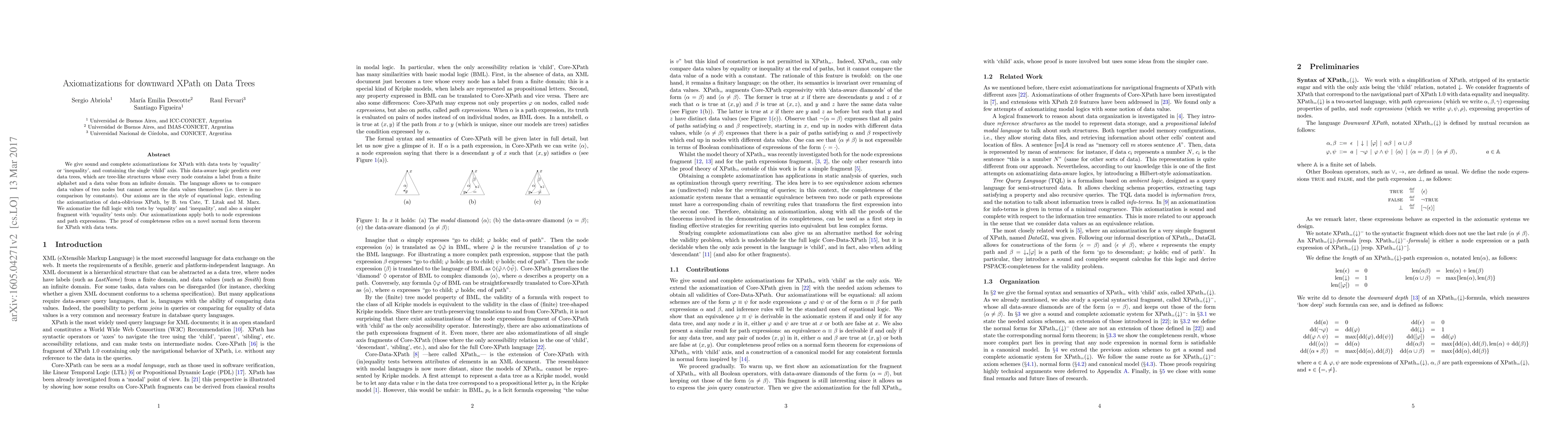 This paper provides sound and complete axiomatizations for a data-aware version of XPath that includes equality and inequality tests on node data values, but not constant comparisons. The authors extend previous work on data-oblivious XPath and introduce novel normal form theorems to prove completeness.
