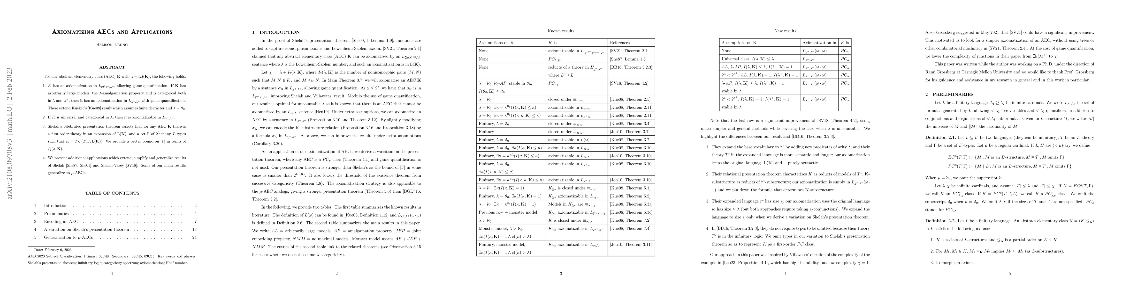 For any abstract elementary class (AEC) ${\bf K}$ with $\lambda=LS({\bf K})$, the following holds: 1. $K$ has an axiomatization in $L_{(2^\lambda)^+,\lambda^+}$, allowing game quantification. If ${\bf K}$ has arbitrarily large models, the $\lambda$-amalgamation property and is categorical both in $\lambda$ and $\lambda^+$, then it has an axiomatization in $L_{\lambda^{+},\lambda^{+}}$ with game quantification. These extend Kueker's result which assumes finite character and $\lambda=\aleph_0$. 2. If $K$ is universal and categorical in $\lambda$, then it is axiomatizable in $L_{\lambda^+,\lambda^+}$. 3. Shelah's celebrated presentation theorem asserts that for any AEC ${\bf K}$ there is a first-order theory in an expansion of $L({\bf K})$, and a set $\Gamma$ of $2^\lambda$ many $T$-types such that $K=PC(T,\Gamma,L({\bf K}))$. We provide a better bound on $|\Gamma|$ in terms of $I_2(\lambda,{\bf K})$. 4. We present additional applications which extend, simplify and generalize results of Shelah and Shelah-Vasey. Some of our main results generalize to $\mu$-AECs.