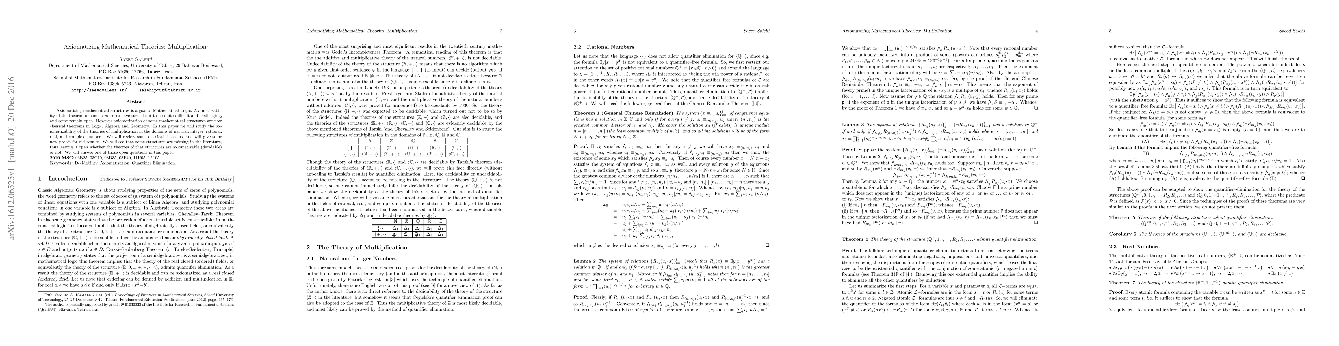 Axiomatizing mathematical structures is a goal of Mathematical Logic. Axiomatizability of the theories of some structures have turned out to be quite difficult and challenging, and some remain open. However axiomatization of some mathematical structures are now classical theorems in Logic, Algebra and Geometry. In this paper we will study the axiomatizability of the theories of multiplication in the domains of natural, integer, rational, real, and complex numbers. We will review some classical theorems, and will give some new proofs for old results. We will see that some structures are missing in the literature, thus leaving it open whether the theories of that structures are axiomatizable (decidable) or not. We will answer one of those open questions in this paper.
