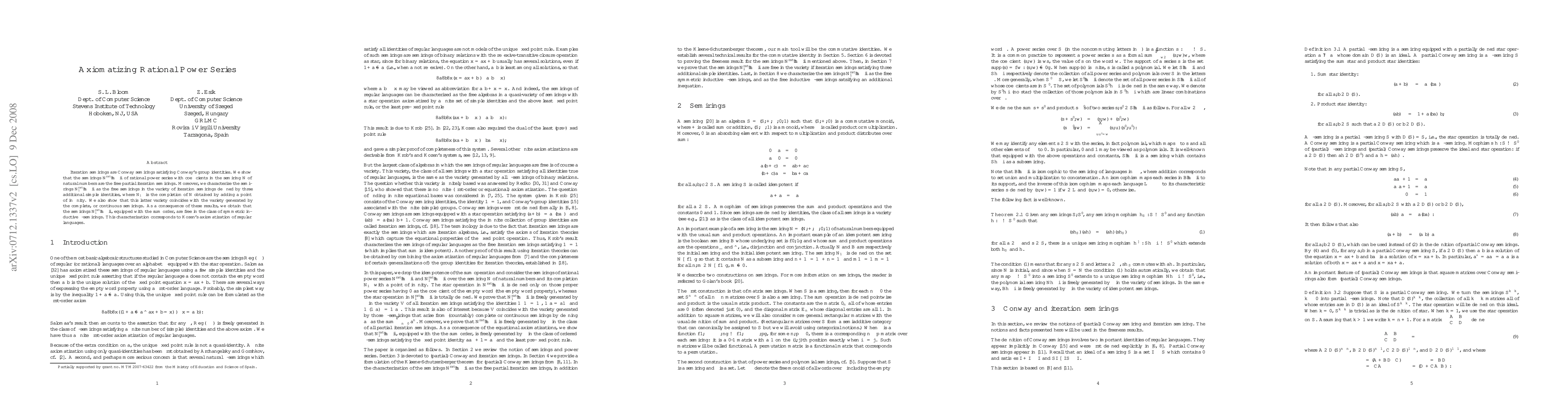 This paper axiomatizes rational power series within iteration semirings, demonstrating that $\N^{\rat}\llangle \Sigma^* \rrangle$ are the free partial iteration semirings and $\N_\infty^{\rat}\llangle \Sigma^* \rrangle$ are the free semirings in the variety of iteration semirings, coinciding with the variety of complete semirings.
