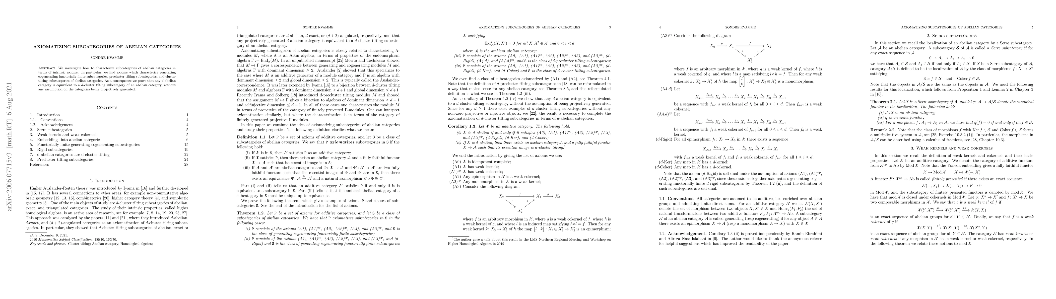 This paper develops intrinsic axioms to characterize specific subcategories within abelian categories, including generating, precluster tilting, and cluster tilting subcategories. It also demonstrates that any $d$-abelian category is equivalent to a $d$-cluster tilting subcategory of an abelian category without requiring projectivity assumptions.