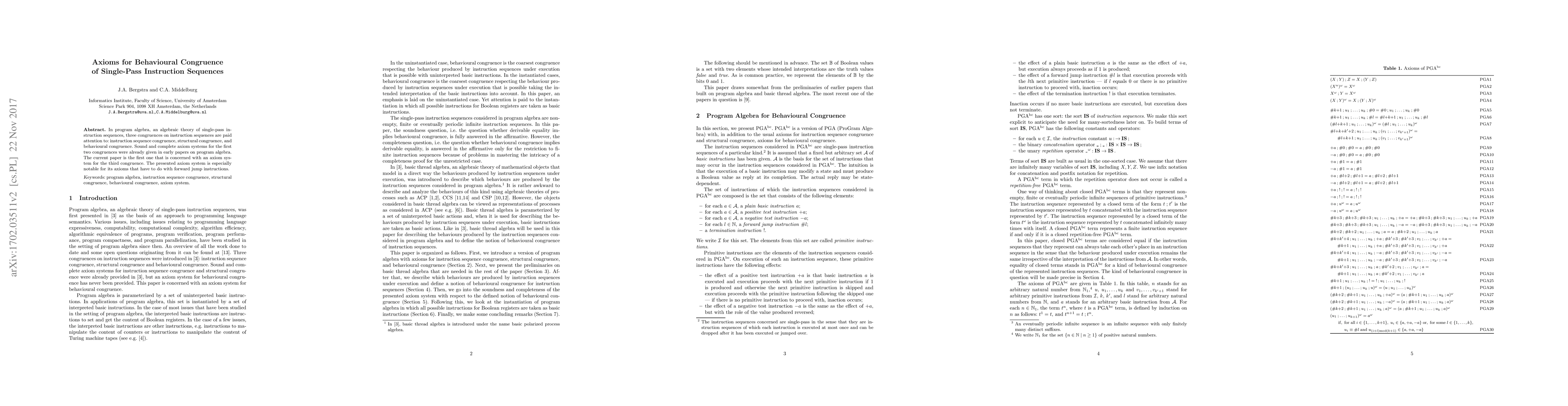 This paper introduces the first axiom system for behavioral congruence of single-pass instruction sequences in program algebra, focusing particularly on axioms related to forward jump instructions. It complements existing systems for instruction and structural congruences.