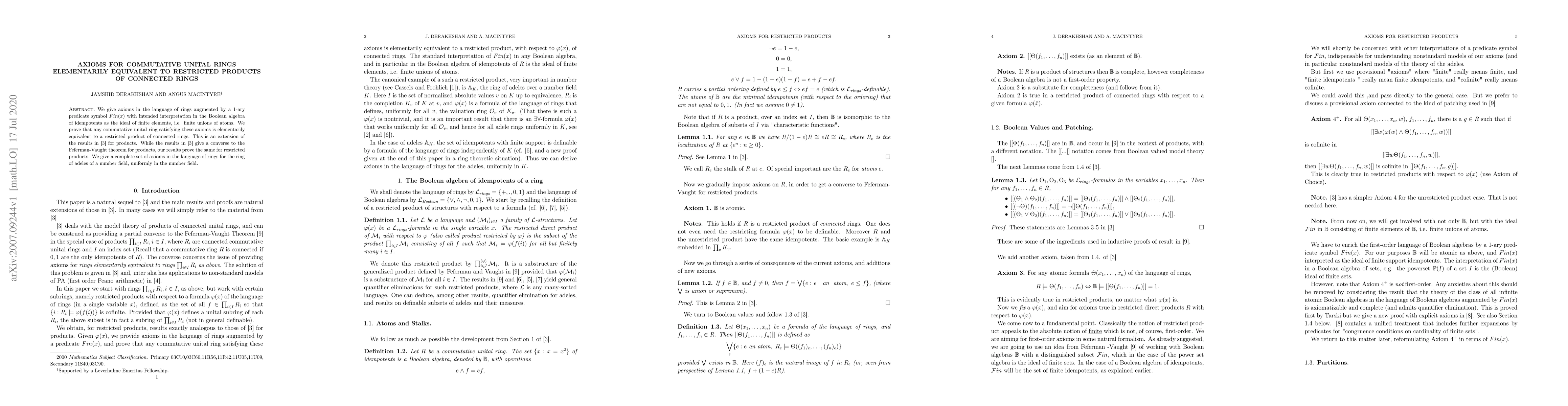 This paper presents axioms for commutative unital rings that define them as elementarily equivalent to restricted products of connected rings. It extends previous results for unrestricted products and provides a complete set of axioms for the ring of adeles of a number field.