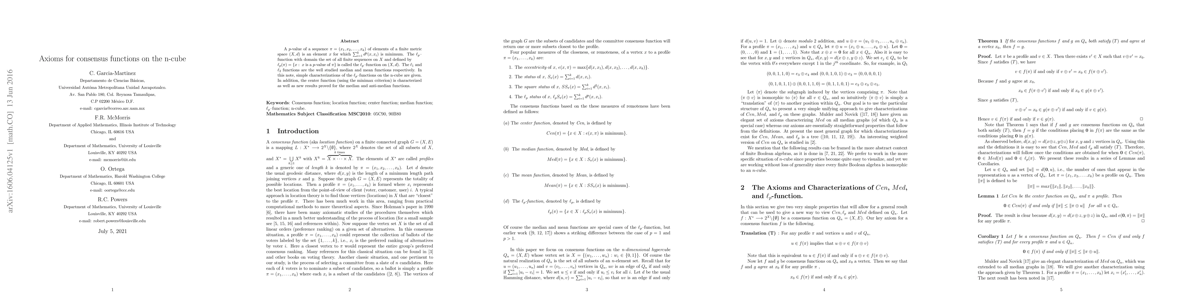 This paper proves a fundamental result that characterizes well-known consensus functions (median, mean, and center) on the n-cube, and introduces new characterizations for the median and anti-median functions.