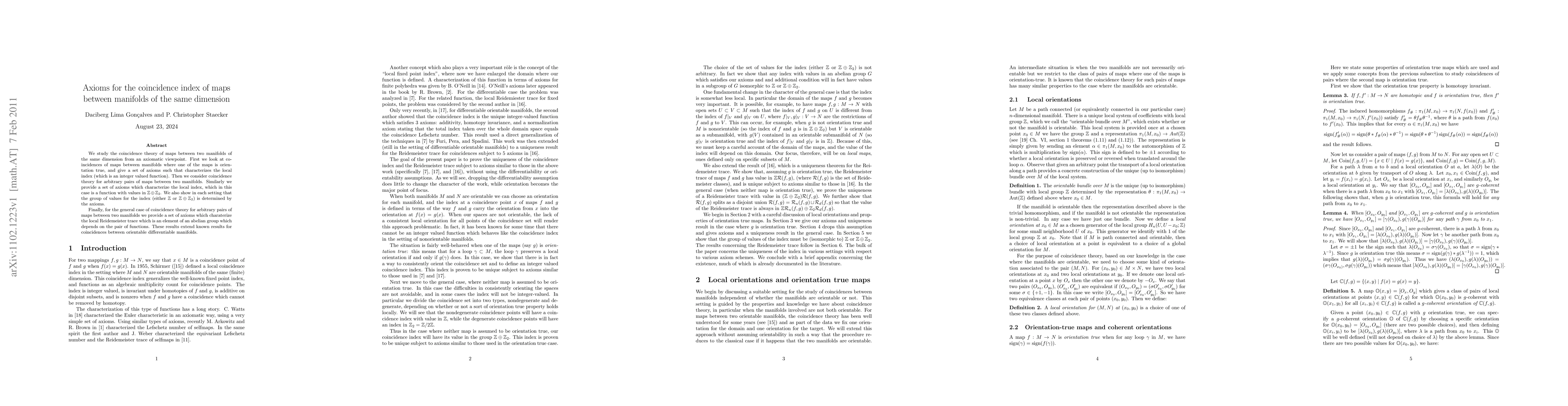 We study the coincidence theory of maps between two manifolds of the same dimension from an axiomatic viewpoint. First we look at coincidences of maps between manifolds where one of the maps is orientation true, and give a set of axioms such that characterizes the local index (which is an integer valued function). Then we consider coincidence theory for arbitrary pairs of maps between two manifolds. Similarly we provide a set of axioms which characterize the local index, which in this case is a function with values in $\Z\oplus \Z_2$. We also show in each setting that the group of values for the index (either $\Z$ or $\Z\oplus \Z_2$) is determined by the axioms. Finally, for the general case of coincidence theory for arbitrary pairs of maps between two manifolds we provide a set of axioms which charaterize the local Reidemeister trace which is an element of an abelian group which depends on the pair of functions. These results extend known results for coincidences between orientable differentiable manifolds.