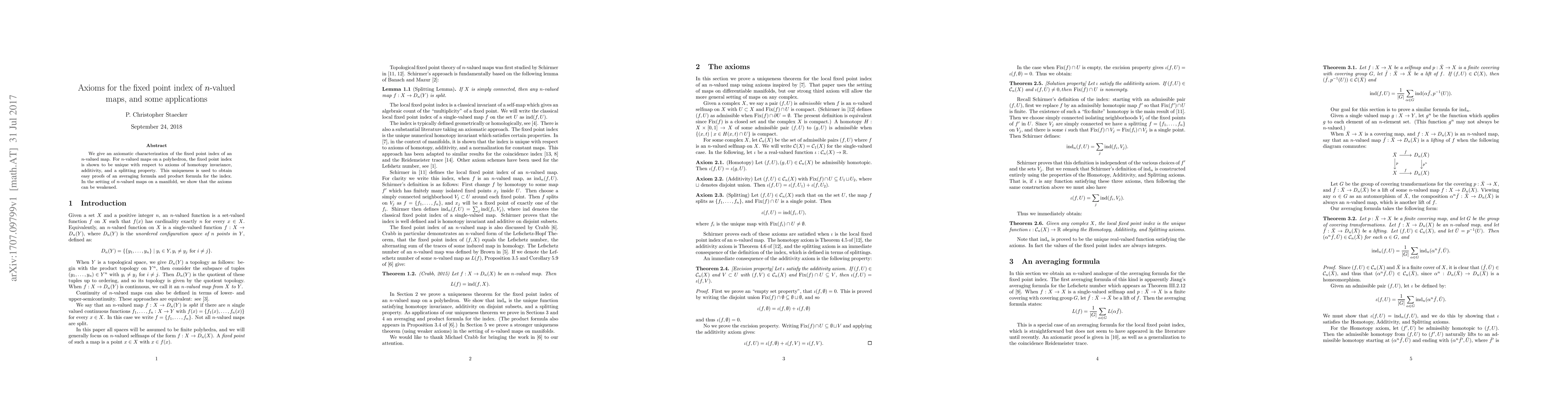This paper presents an axiomatic characterization of the fixed point index for $n$-valued maps, proving its uniqueness on polyhedra under homotopy invariance, additivity, and a splitting property. It also demonstrates simplified proofs for averaging and product formulas for this index.