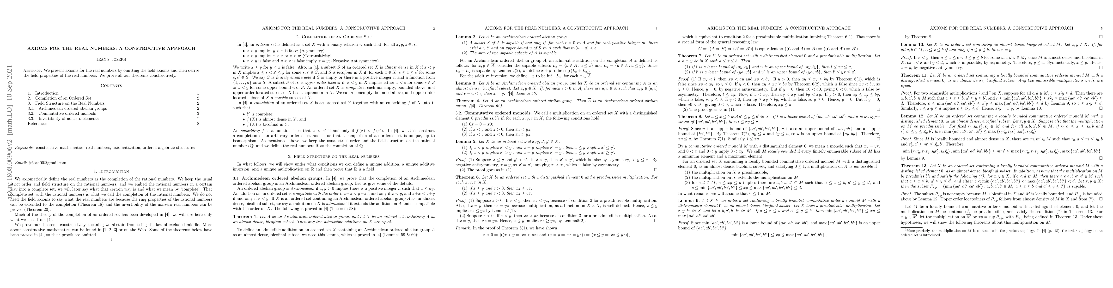 We present axioms for the real numbers by omitting the field axioms and then derive the field properties of the real numbers. We prove all our theorems constructively.