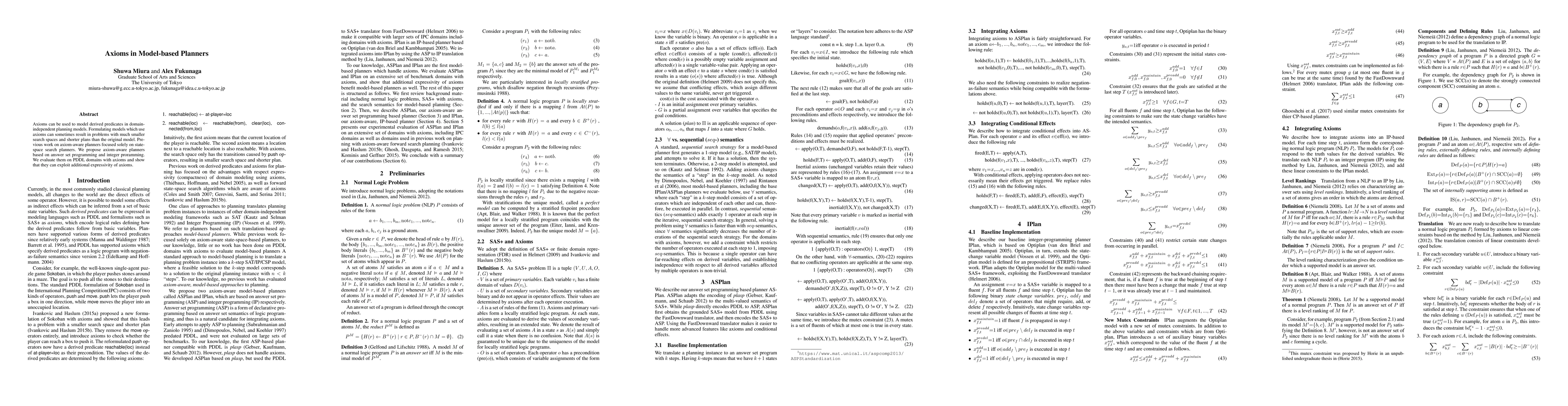 Axioms can be used to model derived predicates in domain- independent planning models. Formulating models which use axioms can sometimes result in problems with much smaller search spaces and shorter plans than the original model. Previous work on axiom-aware planners focused solely on state- space search planners. We propose axiom-aware planners based on answer set programming and integer programming. We evaluate them on PDDL domains with axioms and show that they can exploit additional expressivity of axioms.