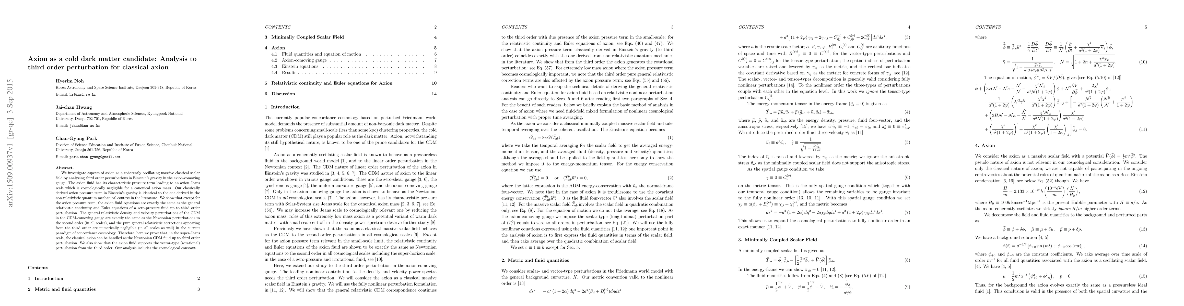 We investigate aspects of axion as a coherently oscillating massive classical scalar field by analyzing third order perturbations in Einstein's gravity in the axion-comoving gauge. The axion fluid has its characteristic pressure term leading to an axion Jeans scale which is cosmologically negligible for a canonical axion mass. Our classically derived axion pressure term in Einstein's gravity is identical to the one derived in the non-relativistic quantum mechanical context in the literature. We show that except for the axion pressure term, the axion fluid equations are exactly the same as the general relativistic continuity and Euler equations of a zero-pressure fluid up to third order perturbation. The general relativistic density and velocity perturbations of the CDM in the CDM-comoving gauge are exactly the same as the Newtonian perturbations to the second order (in all scales), and the pure general relativistic corrections appearing from the third order are numerically negligible (in all scales as well) in the current paradigm of concordance cosmology. Therefore, here we prove that, in the super-Jeans scale, the classical axion can be handled as the Newtonian CDM fluid up to third order perturbation. We also show that the axion fluid supports the vector-type (rotational) perturbation from the third order. Our analysis includes the cosmological constant.