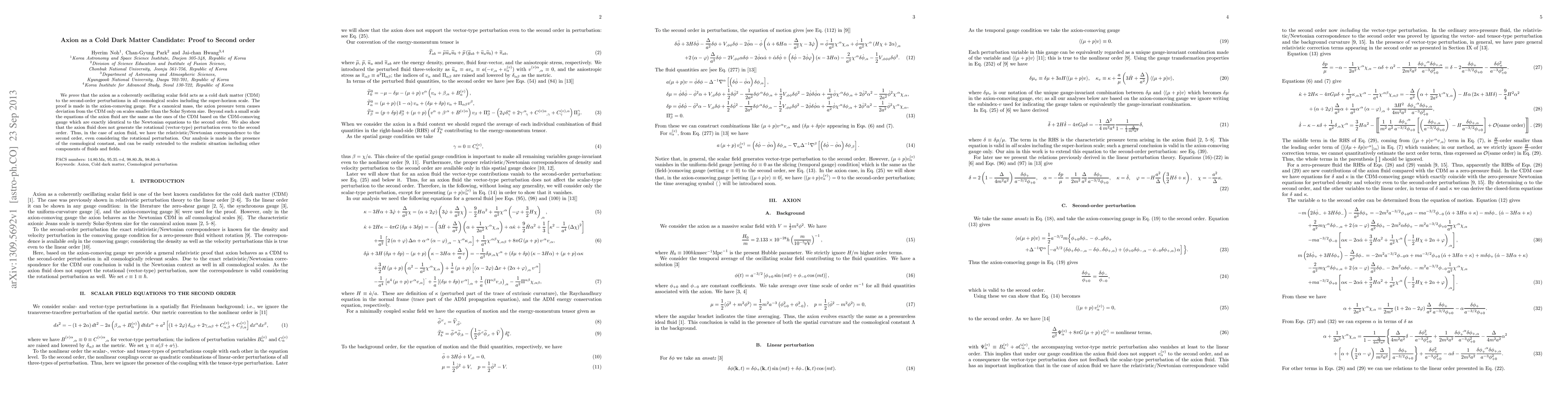 This paper proves that the axion, as a coherently oscillating scalar field, behaves as cold dark matter (CDM) up to second-order perturbations across all cosmological scales. The analysis shows that the axion fluid mimics CDM behavior beyond Solar System scales, maintaining relativistic/Newtonian correspondence even without generating rotational perturbations.
