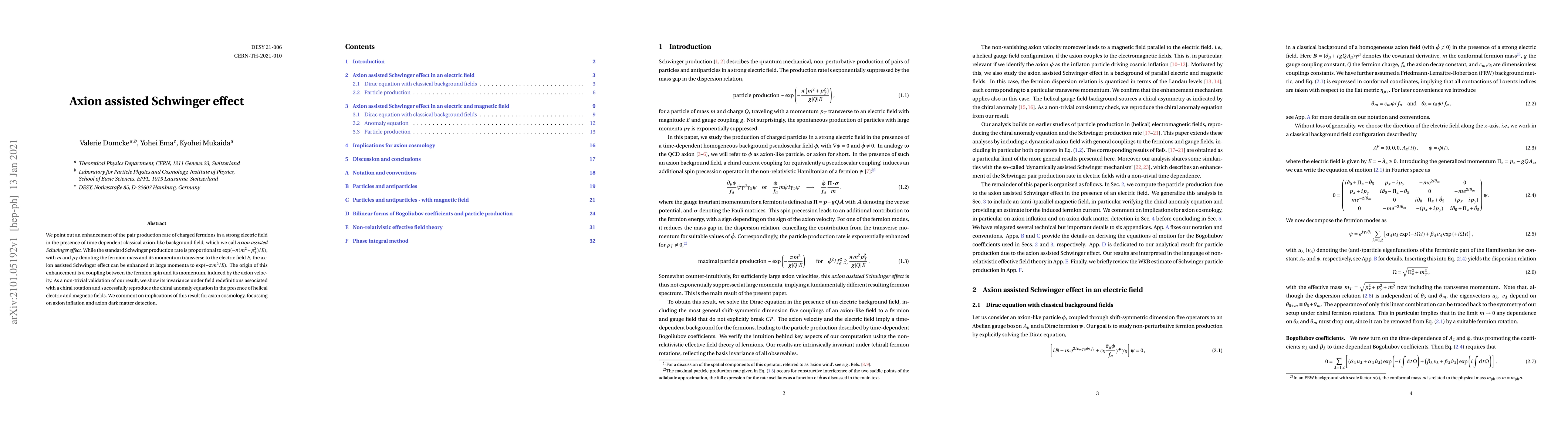 This paper explores the axion assisted Schwinger effect, demonstrating an enhancement of charged fermion pair production in strong electric fields due to a time-dependent axion-like background field. The effect modifies the standard Schwinger production rate, potentially increasing it at large momenta, and has implications for axion cosmology, including axion inflation and dark matter detection.