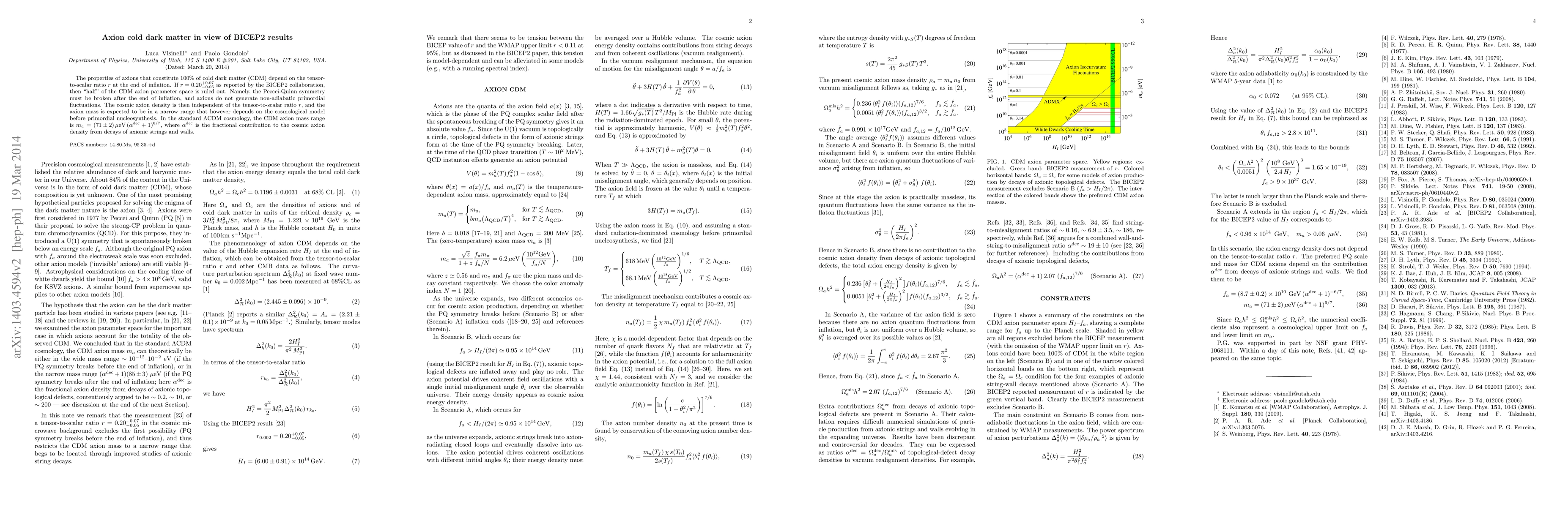 This paper explores the implications of BICEP2's tensor-to-scalar ratio $r$ on axion cold dark matter, ruling out half the axion parameter space if $r=0.20^{+0.07}_{-0.05}$. The Peccei-Quinn symmetry must be broken post-inflation, leading to axion mass in the range $m_a = (71 \pm 2) \mu{\rm eV}$ in standard $\Lambda$CDM cosmology.