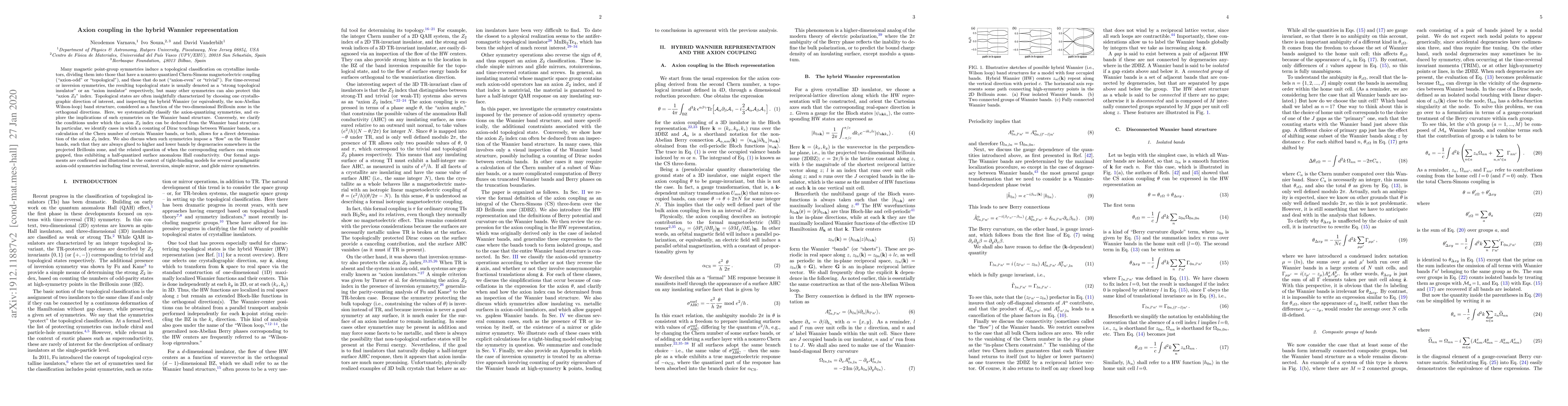 Many magnetic point-group symmetries induce a topological classification on crystalline insulators, dividing them into those that have a nonzero quantized Chern-Simons magnetoelectric coupling ("axion-odd" or "topological"), and those that do not ("axion-even" or "trivial"). For time-reversal or inversion symmetries, the resulting topological state is usually denoted as a "strong topological insulator" or an "axion insulator" respectively, but many other symmetries can also protect this "axion $Z_2$" index. Topological states are often insightfully characterized by choosing one crystallographic direction of interest, and inspecting the hybrid Wannier (or equivalently, the non-Abelian Wilson-loop) band structure, considered as a function of the two-dimensional Brillouin zone in the orthogonal directions. Here, we systematically classify the axion-quantizing symmetries, and explore the implications of such symmetries on the Wannier band structure. Conversely, we clarify the conditions under which the axion$Z_2$ index can be deduced from the Wannier band structure. In particular, we identify cases in which a counting of Dirac touchings between Wannier bands, or a calculation of the Chern number of certain Wannier bands, or both, allows for a direct determination of the axion $Z_2$ index. We also discuss when such symmetries impose a "flow" on the Wannier bands, such that they are always glued to higher and lower bands by degeneracies somewhere in the projected Brillouin zone, and the related question of when the corresponding surfaces can remain gapped, thus exhibiting a half-quantized surface anomalous Hall conductivity. Our formal arguments are confirmed and illustrated in the context of tight-binding models for several paradigmatic axion-odd symmetries including time reversal, inversion, simple mirror, and glide mirror symmetries.