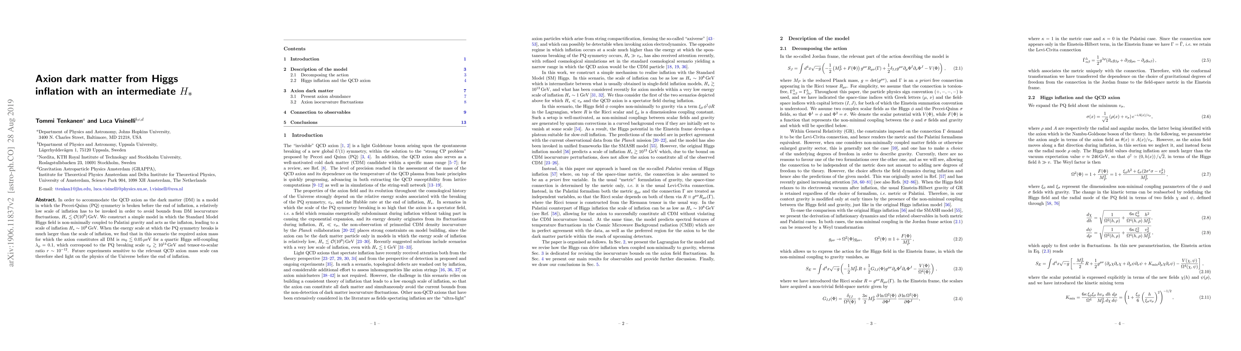 In order to accommodate the QCD axion as the dark matter (DM) in a model in which the Peccei-Quinn (PQ) symmetry is broken before the end of inflation, a relatively low scale of inflation has to be invoked in order to avoid bounds from DM isocurvature fluctuations, $H_* \lesssim \mathcal{O}(10^9)\,$GeV. We construct a simple model in which the Standard Model Higgs field is non-minimally coupled to Palatini gravity and acts as the inflaton, leading to a scale of inflation $H_* \sim 10^8\,$GeV. When the energy scale at which the PQ symmetry breaks is much larger than the scale of inflation, we find that in this scenario the required axion mass for which the axion constitutes all DM is $m_0 \lesssim 0.05{\rm \,\mu eV}$ for a quartic Higgs self-coupling $\lambda_\phi = 0.1$, which correspond to the PQ breaking scale $v_\sigma \gtrsim 10^{14}\,$GeV and tensor-to-scalar ratio $r \sim 10^{-12}$. Future experiments sensitive to the relevant QCD axion mass scale can therefore shed light on the physics of the Universe before the end of inflation.