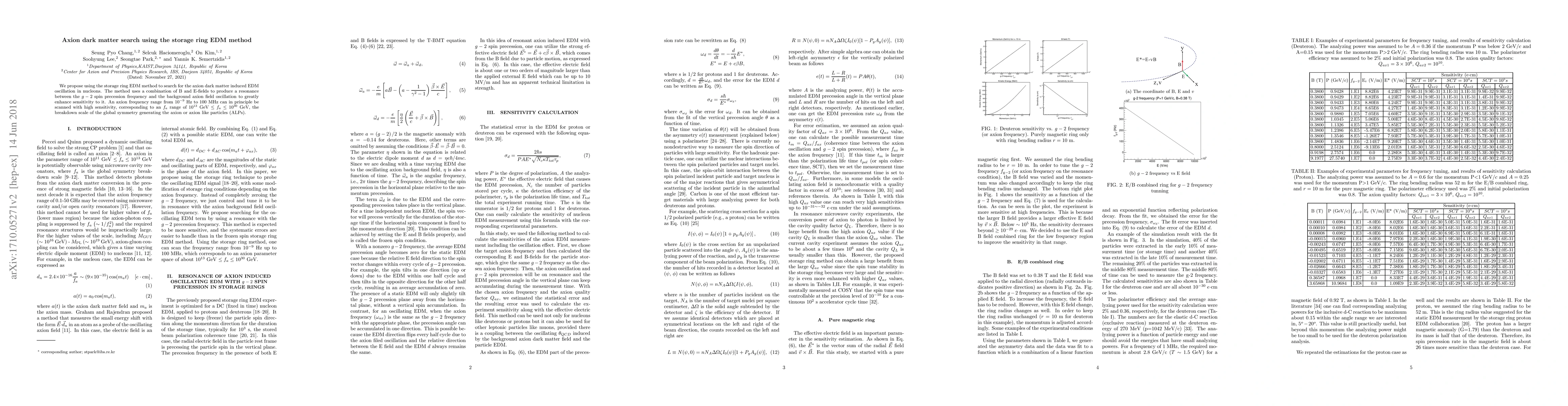 The storage ring EDM method is used to search for axion dark matter induced EDM oscillation in nucleons.