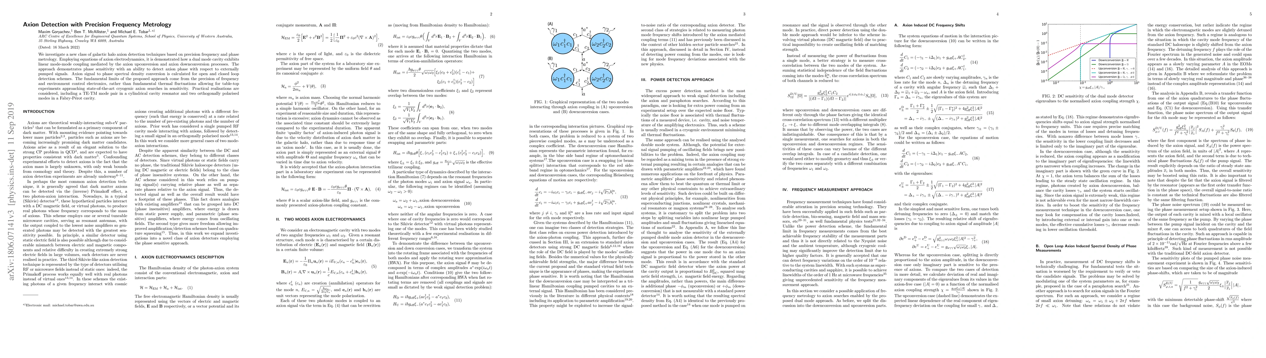 We investigate a new class of galactic halo axion detection techniques based on precision frequency and phase metrology. Employing equations of axion electrodynamics, it is demonstrated how a dual mode cavity exhibits linear mode-mode coupling mediated by the axion upconversion and axion downconversion processes. The approach demonstrates phase sensitivity with an ability to detect axion phase with respect to externally pumped signals. Axion signal to phase spectral density conversion is calculated for open and closed loop detection schemes. The fundamental limits of the proposed approach come from the precision of frequency and environment control electronics, rather than fundamental thermal fluctuations allowing for table-top experiments approaching state-of-the-art cryogenic axion searches in sensitivity. Practical realisations are considered, including a TE-TM mode pair in a cylindrical cavity resonator and two orthogonally polarised modes in a Fabry-P{\'e}rot cavity.