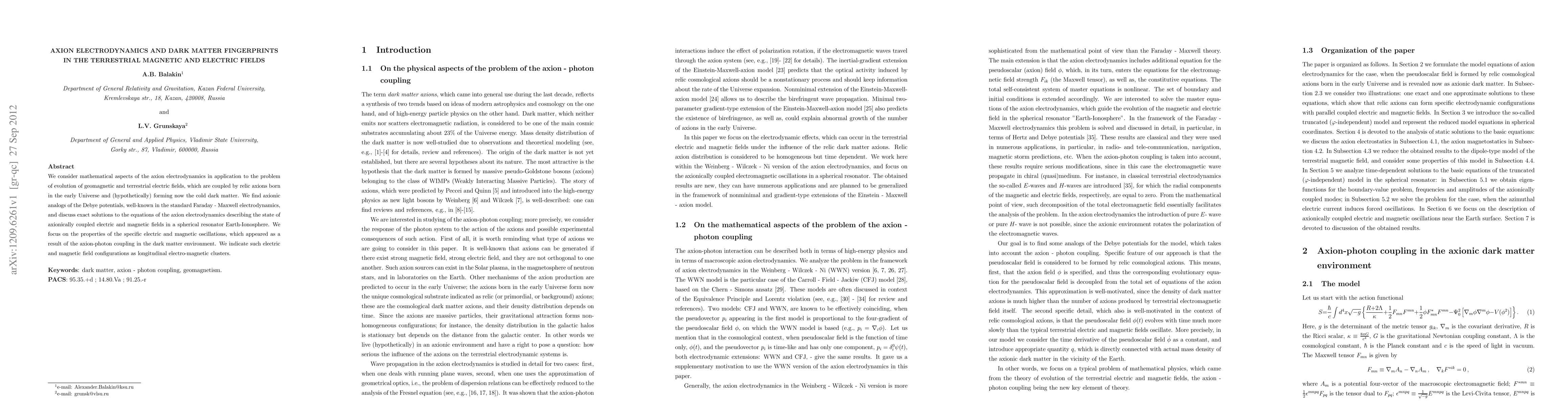 This paper explores the mathematical framework of axion electrodynamics to study the evolution of geomagnetic and terrestrial electric fields, suggesting that relic axions from the early Universe could form the cold dark matter. It identifies axionic analogs of Debye potentials and discusses exact solutions for axionically coupled electric and magnetic fields within a spherical Earth-Ionosphere model, highlighting the emergence of longitudinal electro-magnetic clusters due to axion-photon coupling.
