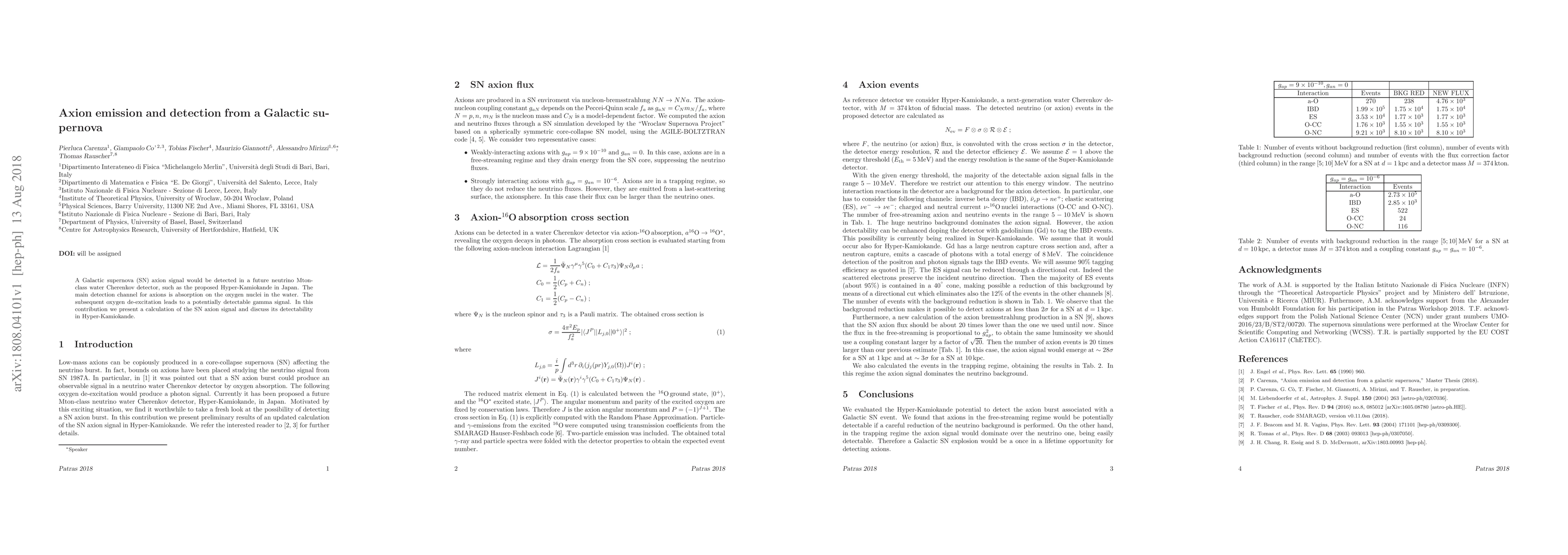 This paper calculates the axion emission from a Galactic supernova and explores its detectability in future neutrino detectors like Hyper-Kamiokande, focusing on the axion absorption on oxygen nuclei in water and the subsequent gamma signal.