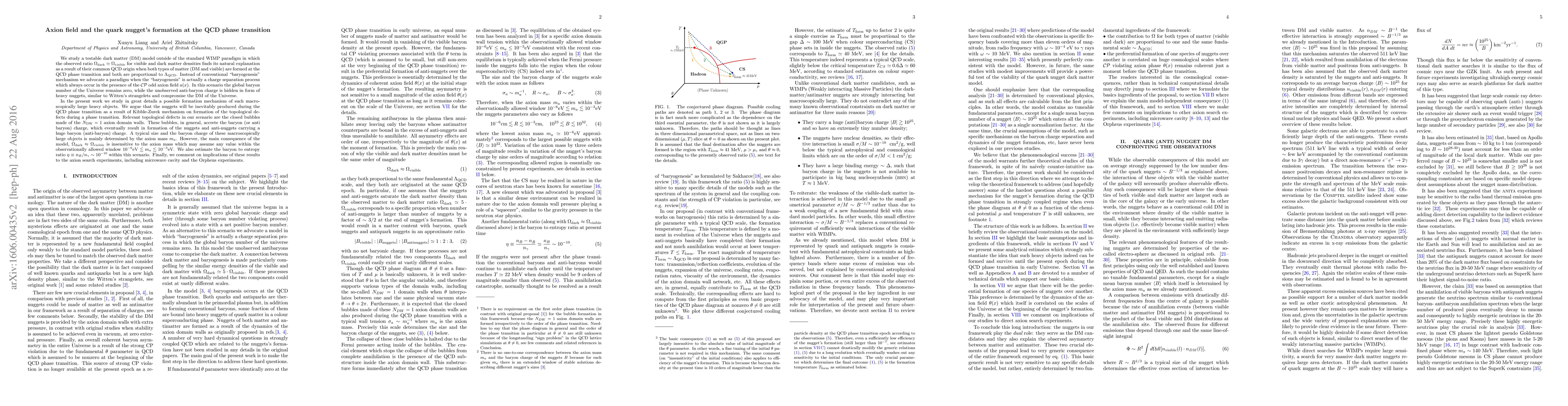 This paper explores a dark matter model where dark and visible matter densities arise from the same QCD phase transition, proposing that dark matter consists of quark nuggets formed via topological defects in the axion field. The model suggests that the baryon charge is separated into these nuggets, maintaining a zero global baryon number while explaining the observed ratio of dark to visible matter densities.