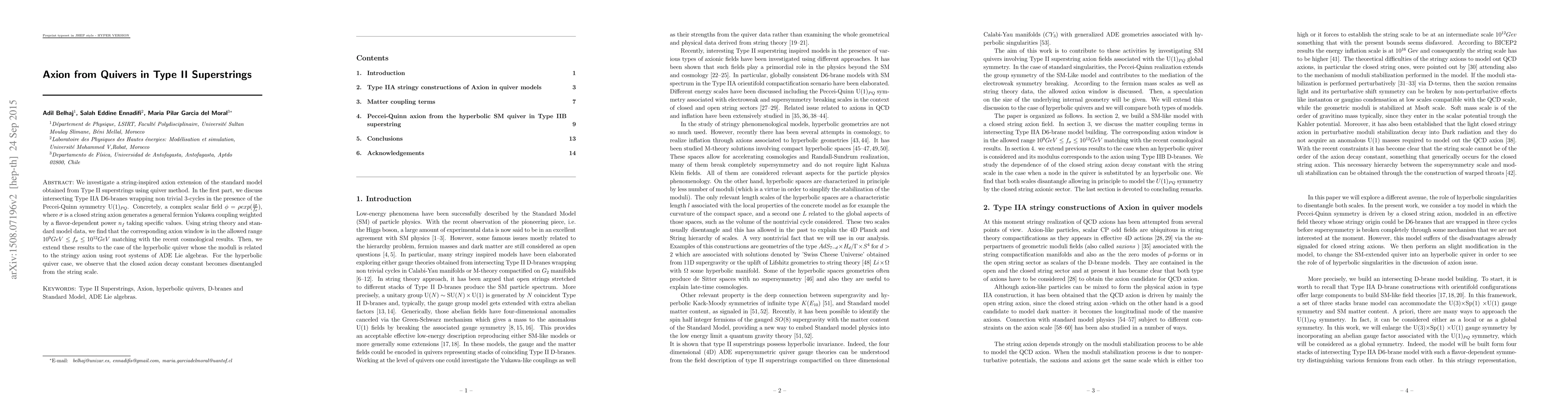 This paper explores a string-inspired axion model in the standard model derived from Type II superstrings using the quiver method, finding that the axion window matches recent cosmological results. It further examines the hyperbolic quiver case, showing the axion decay constant can be separated from the string scale.