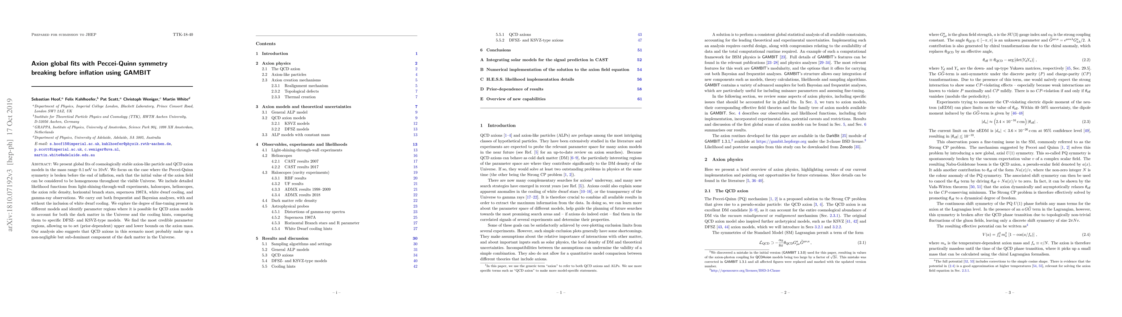 This paper presents global fits for axion-like particles and QCD axion models, focusing on scenarios where Peccei-Quinn symmetry breaks before inflation. It uses GAMBIT to analyze data from various experiments and observations to determine the most credible parameter regions and set bounds on axion mass, suggesting QCD axions likely constitute a sub-dominant dark matter component.
