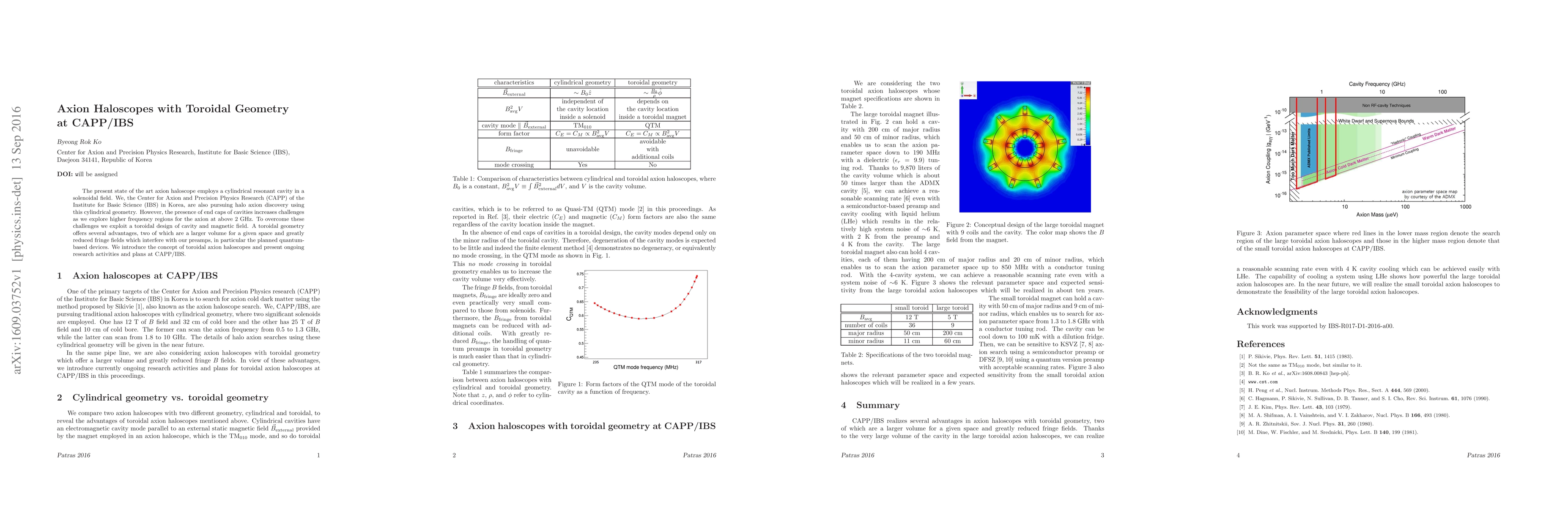 The CAPP/IBS research introduces toroidal axion haloscopes to overcome challenges in cylindrical designs, offering a larger volume and reduced fringe fields for higher frequency axion detection above 2 GHz. Ongoing activities focus on leveraging this geometry for improved axion detection.