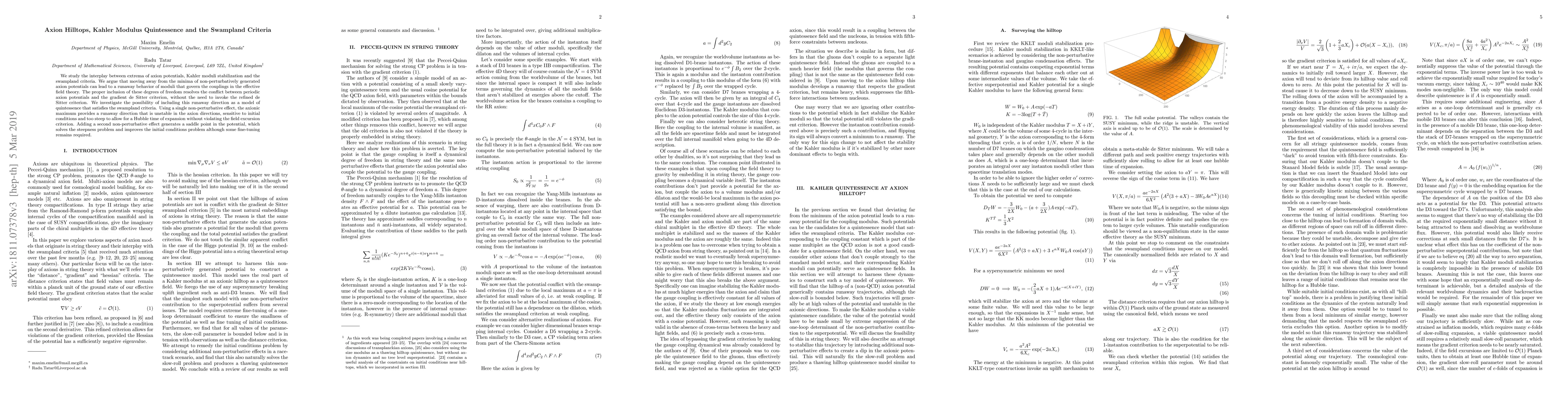 We study the interplay between extrema of axion potentials, Kahler moduli stabilization and the swampland criteria. We argue that moving away from the minima of non-perturbatively generated axion potentials can lead to a runaway behavior of moduli that govern the couplings in the effective field theory. The proper inclusion of these degrees of freedom resolves the conflict between periodic axion potentials and the gradient de Sitter criterion, without the need to invoke the refined de Sitter criterion. We investigate the possibility of including this runaway direction as a model of quintessence that satisfies the swampland criteria. Using a single non-perturbative effect, the axionic maximum provides a runaway direction that is unstable in the axion directions, sensitive to initial conditions and too steep to allow for a Hubble time of expansion without violating the field excursion criterion. Adding a second non-perturbative effect generates a saddle point in the potential, which solves the steepness problem and improves the initial conditions problem although some fine-tuning remains required.