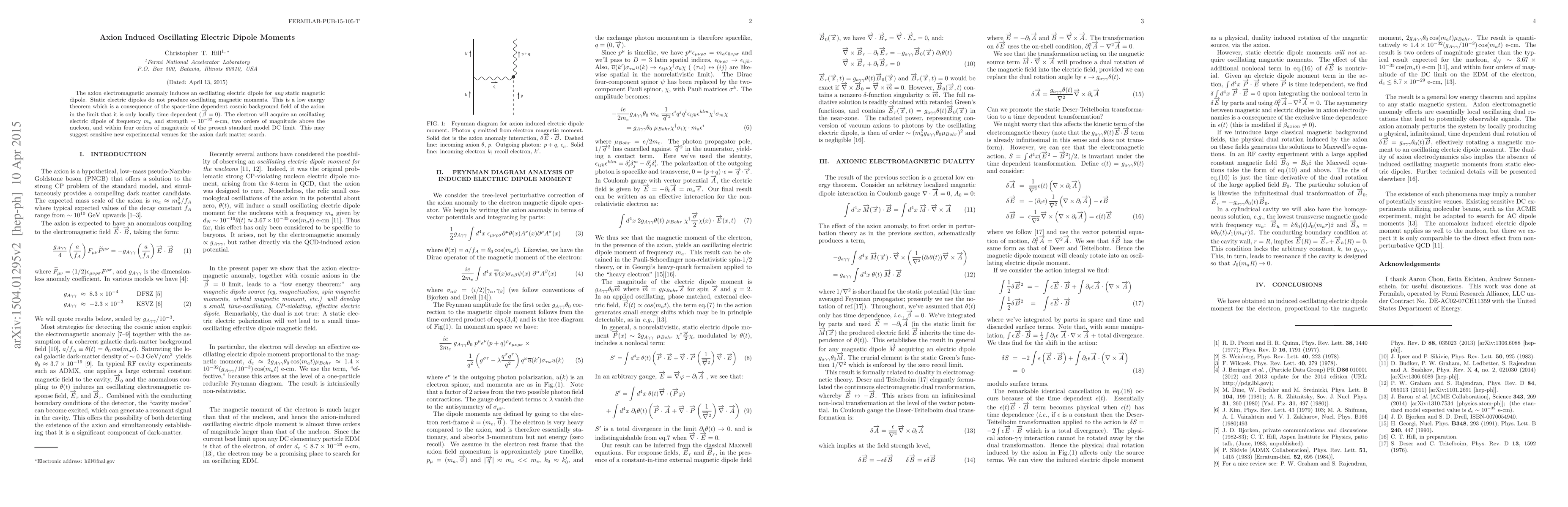 The axion electromagnetic anomaly induces an oscillating electric dipole for {\em any} static magnetic dipole. Static electric dipoles do not produce oscillating magnetic moments. This is a low energy theorem which is a consequence of the space-time dependent cosmic background field of the axion in the limit that it is only locally time dependent $(\overrightarrow{\beta}=0)$. The electron will acquire an oscillating electric dipole of frequency $m_a$ and strength $\sim 10^{-32}$ e-cm, three orders of magnitude above the nucleon, and within four orders of magnitude of the present standard model DC limit. This may suggest sensitive new experimental venues for the axion dark matter search.