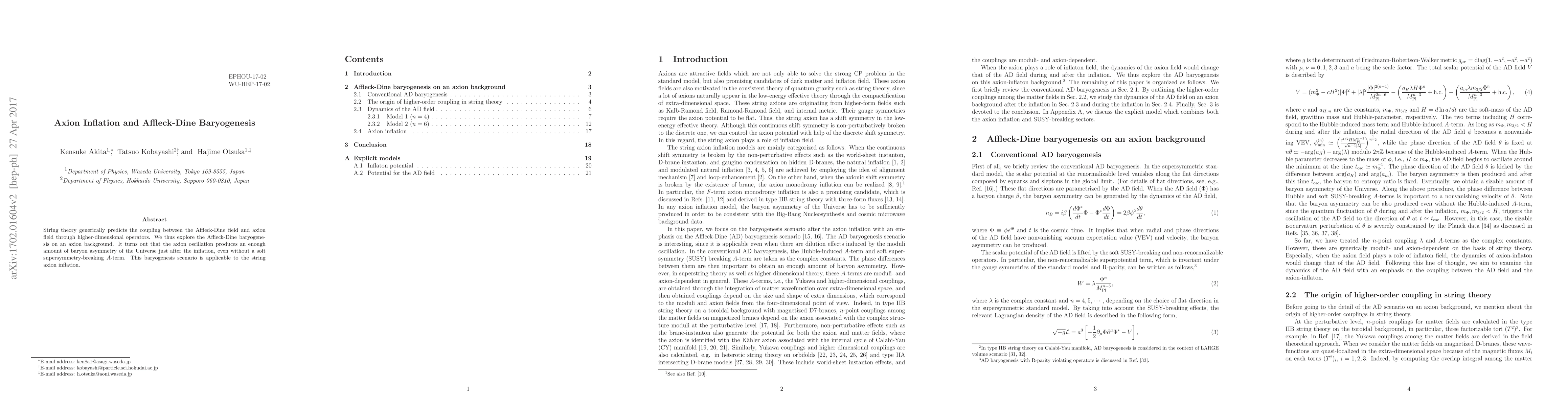 This paper investigates the coupling between the Affleck-Dine and axion fields in string theory, proposing that axion oscillations during inflation can generate sufficient baryon asymmetry without requiring soft supersymmetry-breaking $A$-terms, thereby supporting Affleck-Dine baryogenesis within the framework of axion inflation.