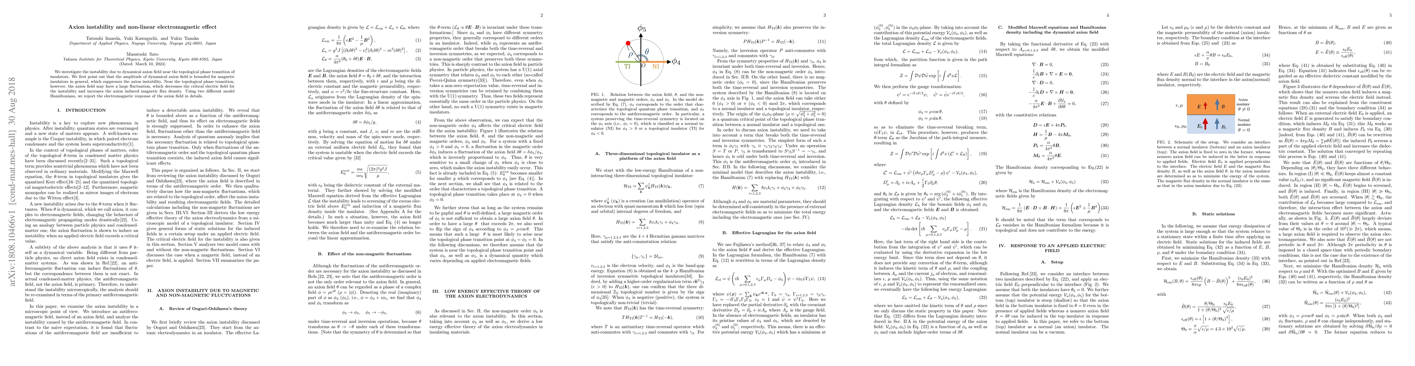 This paper explores the axion instability near topological phase transitions in insulators, noting that while axion field amplitude is generally bounded, large fluctuations near these transitions can reduce the critical electric field for instability and increase axion-induced magnetic flux density. The electromagnetic response is analyzed using two model Hamiltonians.