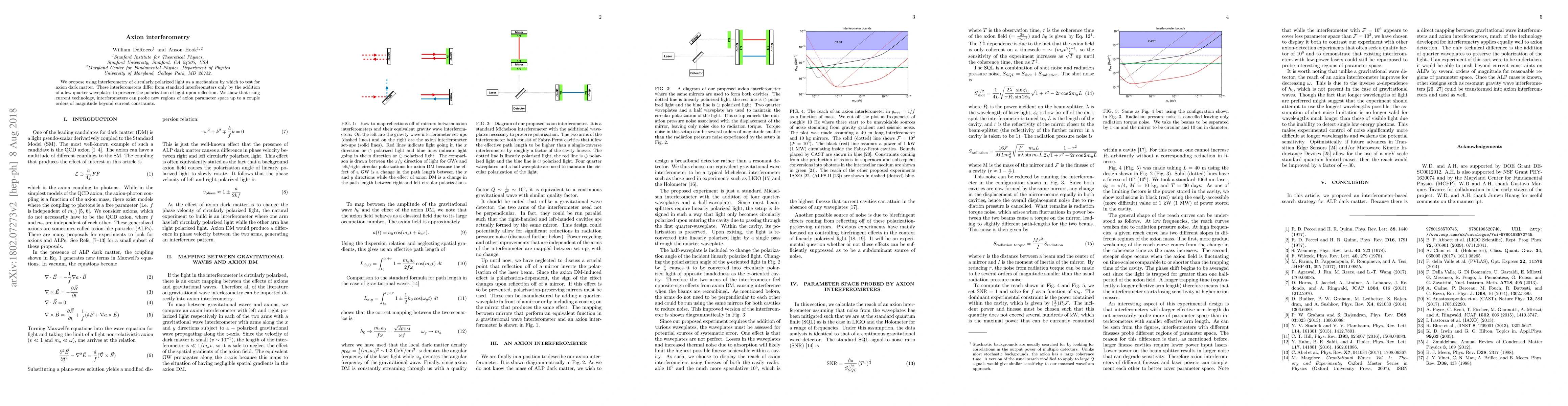 This paper proposes using interferometry of circularly polarized light to detect axion dark matter, utilizing quarter waveplates to maintain light polarization. It demonstrates that current technology can explore axion parameter space significantly beyond existing constraints.