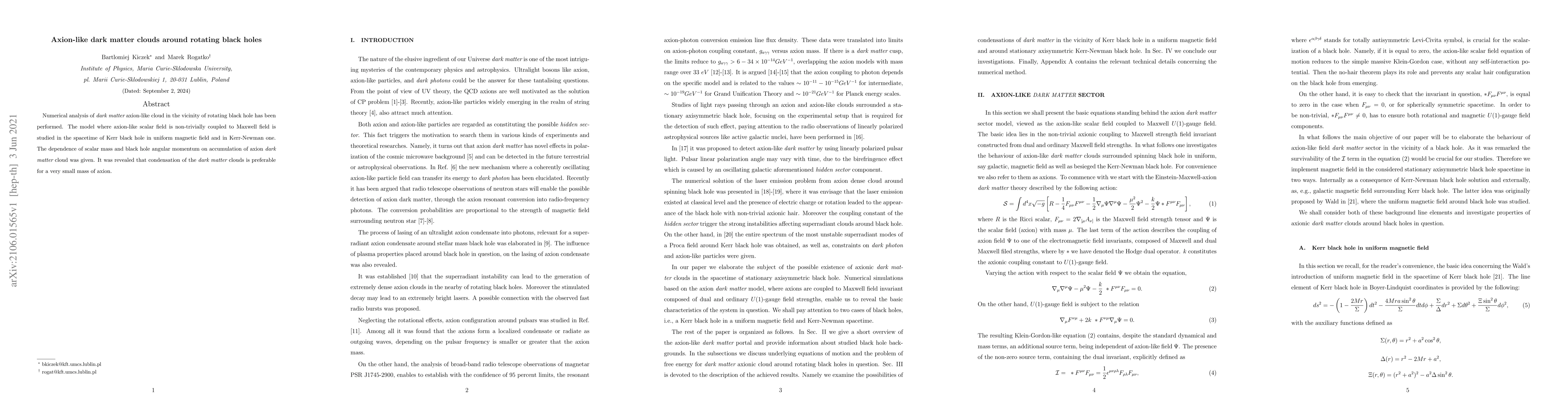 Numerical analysis of dark matter axion-like cloud in the vicinity of rotating black hole has been performed. The model where axion-like scalar field is non-trivially coupled to Maxwell field is studied in the spacetime of Kerr black hole in uniform magnetic field and in Kerr-Newman one. The dependence of scalar mass and black hole angular momentum on accumulation of axion dark matter cloud was given. It was revealed that condensation of the dark matter clouds is preferable for a very small mass of axion.