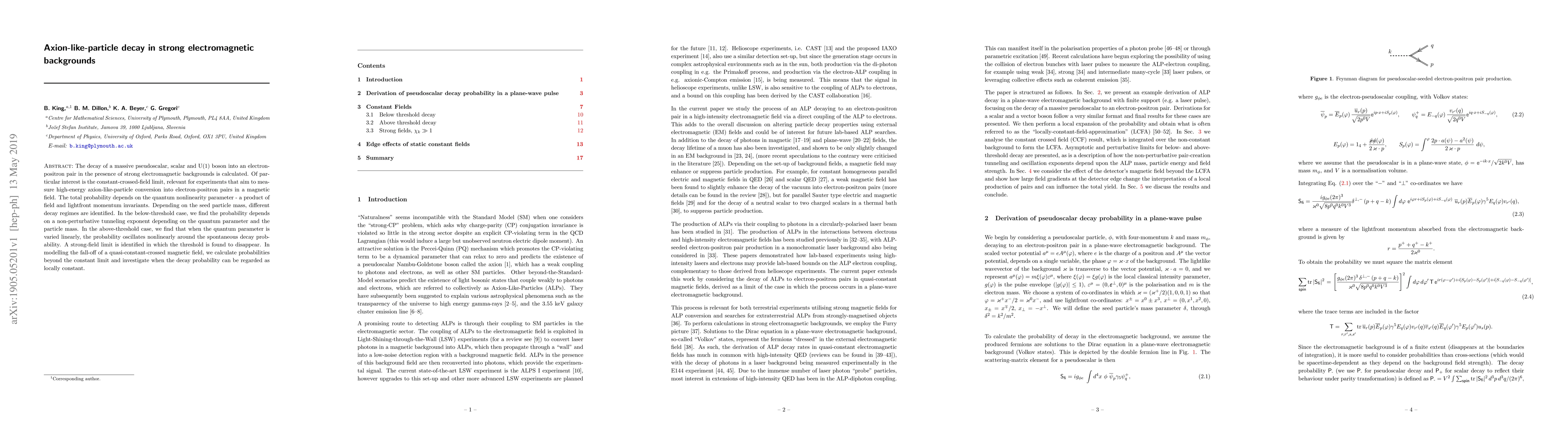 The decay of a massive pseudoscalar, scalar and U(1) boson into an electron-positron pair in the presence of strong electromagnetic backgrounds is calculated. Of particular interest is the constant-crossed-field limit, relevant for experiments that aim to measure high-energy axion-like-particle conversion into electron-positron pairs in a magnetic field. The total probability depends on the quantum nonlinearity parameter - a product of field and lightfront momentum invariants. Depending on the seed particle mass, different decay regimes are identified. In the below-threshold case, we find the probability depends on a non-perturbative tunnelling exponent depending on the quantum parameter and the particle mass. In the above-threshold case, we find that when the quantum parameter is varied linearly, the probability oscillates nonlinearly around the spontaneous decay probability. A strong-field limit is identified in which the threshold is found to disappear. In modelling the fall-off of a quasi-constant-crossed magnetic field, we calculate probabilities beyond the constant limit and investigate when the decay probability can be regarded as locally constant.