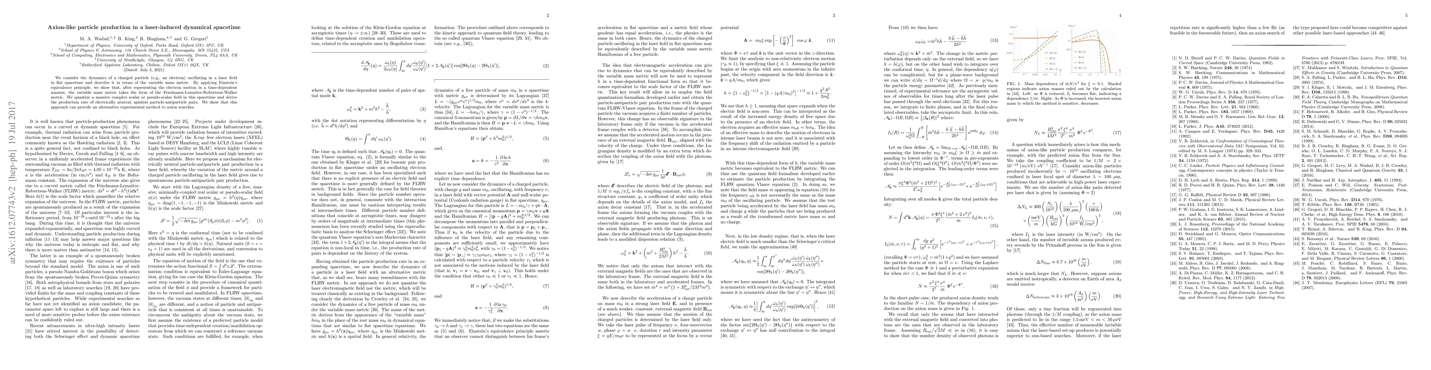 We consider the dynamics of a charged particle (e.g., an electron) oscillating in a laser field in flat spacetime and describe it in terms of the variable mass metric. By applying Einstein's equivalence principle, we show that, after representing the electron motion in a time-dependent manner, the variable mass metric takes the form of the Friedmann-Lema\^itre-Robertson-Walker metric. We quantize a massive complex scalar or pseudo-scalar field in this spacetime and derive the production rate of electrically neutral, spinless particle-antiparticle pairs. We show that this approach can provide an alternative experimental method to axion searches.