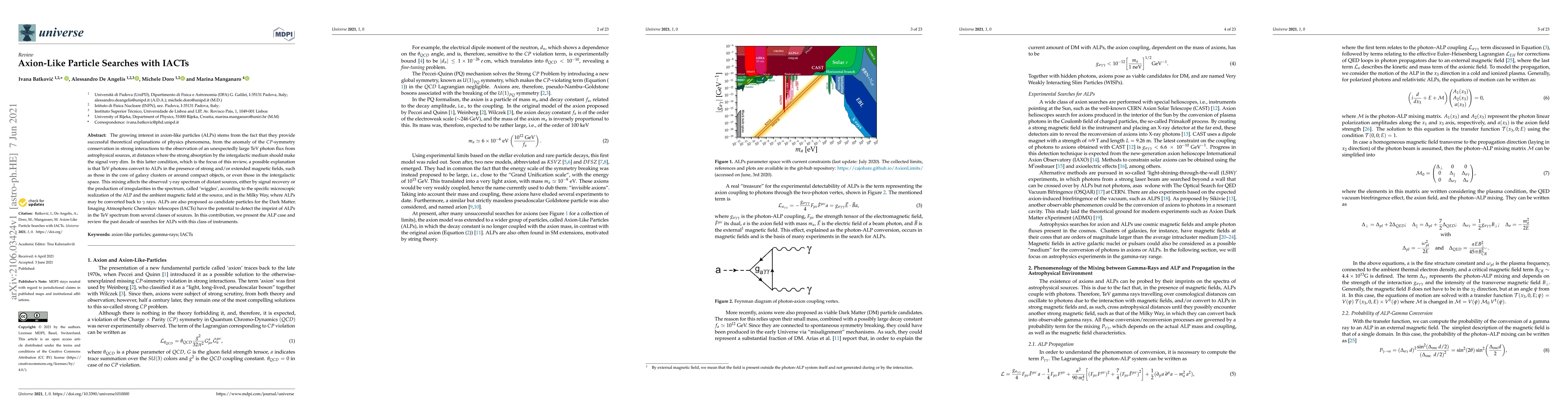 This paper reviews the search for axion-like particles (ALPs) using Imaging Atmospheric Cherenkov telescopes (IACTs), focusing on how ALPs may explain the unexpectedly large TeV photon flux from astrophysical sources. It discusses the detection potential of ALPs in the TeV spectrum from various sources and summarizes the past decade of ALP searches with IACTs.